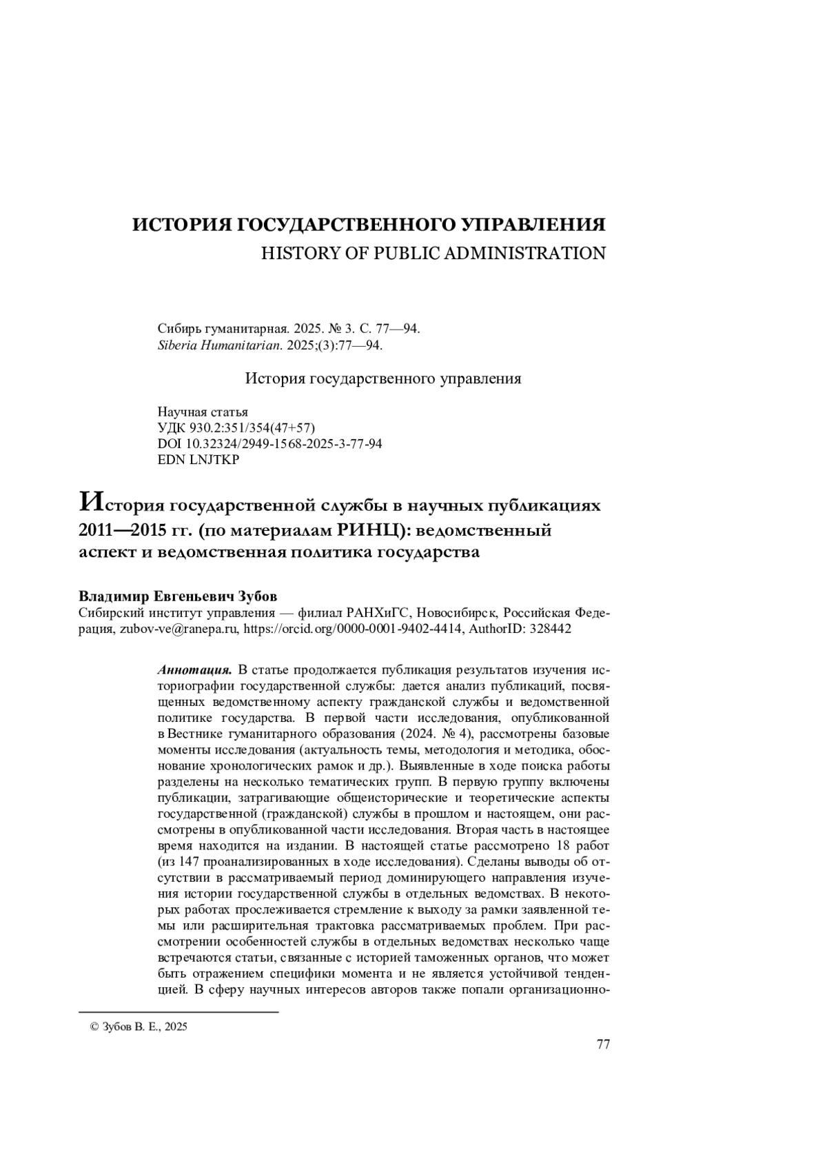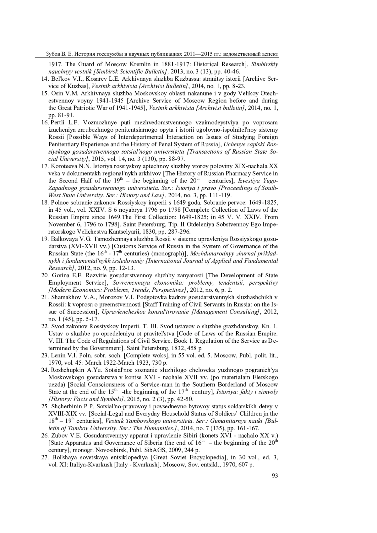 1. Зубов В. Е. История государственной службы в научных публикациях 2011— 2015 гг. (по материалам РИНЦ). Ч. I // Вестник гуманитарного образования. 2024. № 4 (36). С. 9—17.