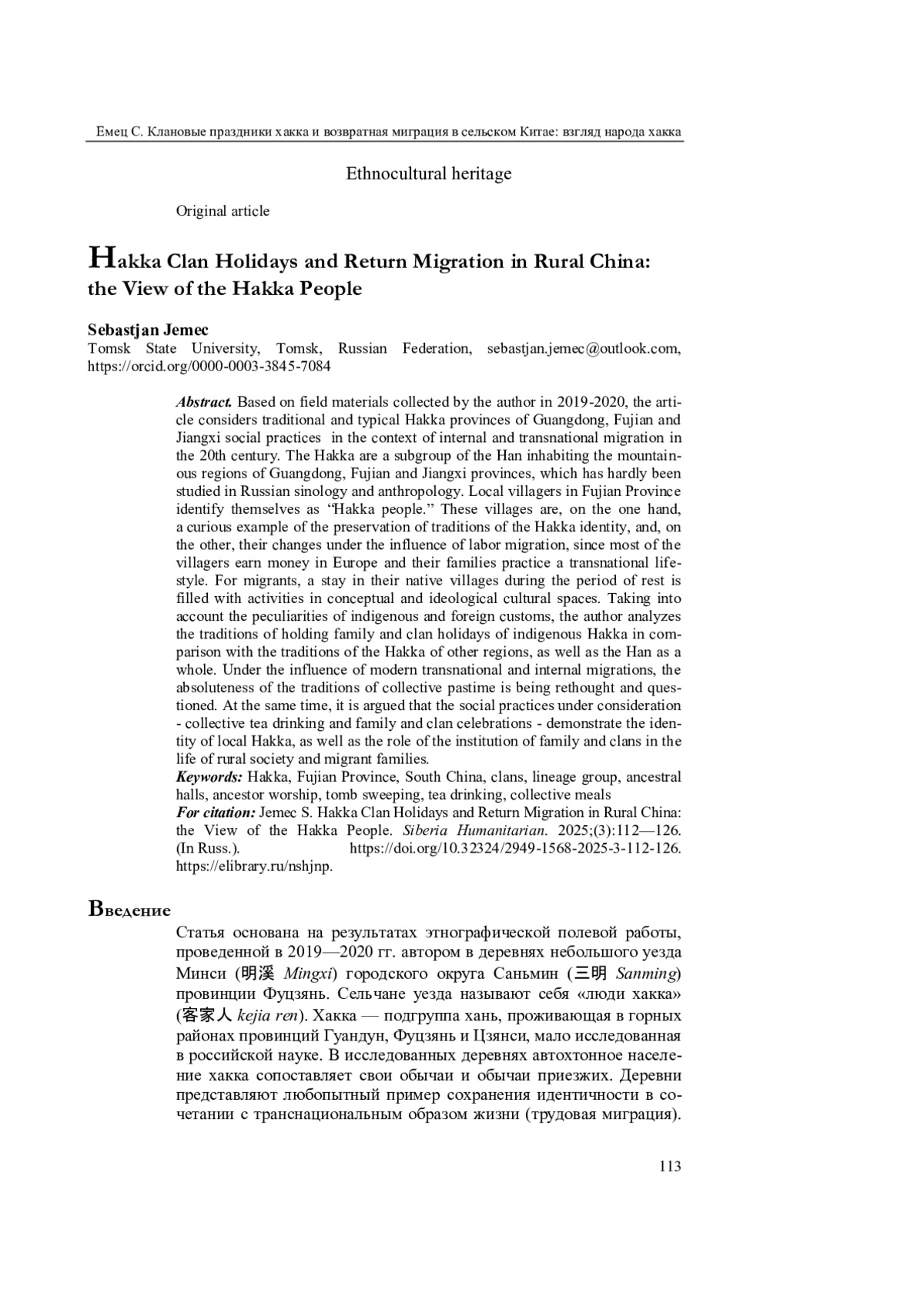 На основе полевых материалов, собранных автором в 2019— 2020 гг., в статье рассматриваются традиционные и типичные для хакка провинций Гуандун, Фуцзянь и Цзянси социальные практики в условиях внутренней и транснациональной миграции в XX в. Хакка — подгруппа хань, населяющая горные районы провинций Гуандун, Фуцзянь и Цзянси, почти не исследованная в российской синологии и антропологии. Местные жители деревень провинции Фуцзянь идентифицируют себя как «люди хакка». Эти деревни представляют собой любопытный пример, с одной стороны, сохранения и традиций идентичности хакка, с другой — их изменения под воздействием трудовой миграции, поскольку большинство сельчан зарабатывает в Европе, а их семьи практикуют транснациональный образ жизни. Для мигрантов пребывание в родных деревнях в период отдыха заполняется мероприятиями в концептуальных и идейных культурных пространствах. Учитывая особенности автохтонных и чужих обычаев, автор анализирует традиции проведения семейно-клановых праздников автохтонных хакка в сравнении с традициями хакка других регионов, а также в целом хань. Под влиянием современных транснациональных и внутренних миграций переосмысливается и подвергается сомнению абсолютность традиций коллективного времяпрепровождения. При этом утверждается, что рассматриваемые социальные практики — коллективное чаепитие и семейно-клановые праздники — демонстрируют идентичность местных хакка, а также роль института семьи и кланов в жизни сельского общества и семей мигрантов.