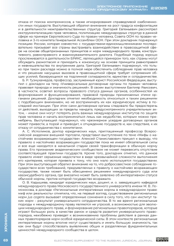 Подготовленная представителями уральской школы международного права монография под ответственной редакцией доктора юридических наук, профессора Л. А. Лазутина и кандидата юридических наук, доцента Р. М. Халафяна посвящена интереснейшей и малоизученной тематике – истории развития отечественной науки международного права. Работа впечатляет уже самим составом авторов, объединяющим набирающих известность юристов-международников: Ю. С. Безбородов, И. А. Ведель, М. А. Лихачев, А. А. Лунев, Н. В. Сметанин, Т. А. Титова, И. В. Федоров, Л. М. Чуркина, Р. М. Халафян. Особенно трогательно в связи с этим упоминание Львом Александровичем Лазутиным в его предисловии к книге того вклада, который внес в отечественную науку Геннадий Владимирович Игнатенко – основатель уральской школы международного права. В этом отношении данный коллективный труд по истории международно-правовых наук сам по себе отражает сложившуюся преемственность поколений и научных традиций.