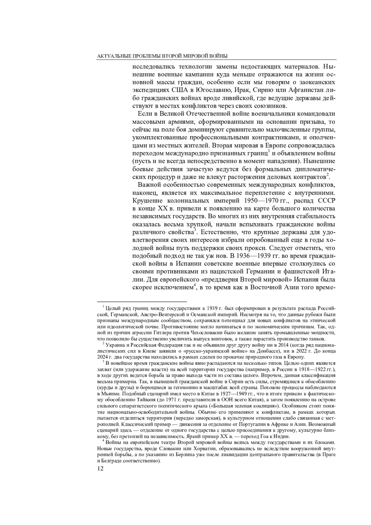 Вторая мировая война в Азии в отечественной историографии традиционно представлено куда скромнее, чем европейский театр боевых действий. Такой подход обусловлен вовлеченностью Советского Союза в борьбу за выживание с Германией, по сравнению с которой противостояние с Японией меркнет. Однако современные условия так называемых новых войн ставят на повестку дня изучение вооруженных конфликтов 1920 и 1930-х гг. (бои на КВЖД, эра милитаристов в Китае, конфликты на о. Хасан и р. Халхин-Гол, походы РККА в Синьцзян), которые происходили в условиях нечетких границ между территориями, де-факто появившимися после распада империи Цин. Как и в современных военных операциях за пределами страны, участвующие контингенты нередко маскировались. Скажем, красноармейцы в Синьцзяне и советские летчики в Центральном Китае официально позиционировались как белогвардейские формирования и могли получать оплату от союзных Москве центров силы в Поднебесной (что отчасти роднит их с современными ЧВК по всему миру). Войны в Китае второй четверти XX в. часто велись непосредственно частными армиями, и даже войска достаточно централизованной Японии нередко действовали по приказу квантунских генералов без согласования с правительством в Токио. Как и в современных военных конфликтах на Ближнем Востоке, одни и те же высокопоставленные деятели могли успеть несколько раз сменить свою позицию в ходе ситуативно образовывающихся союзов.