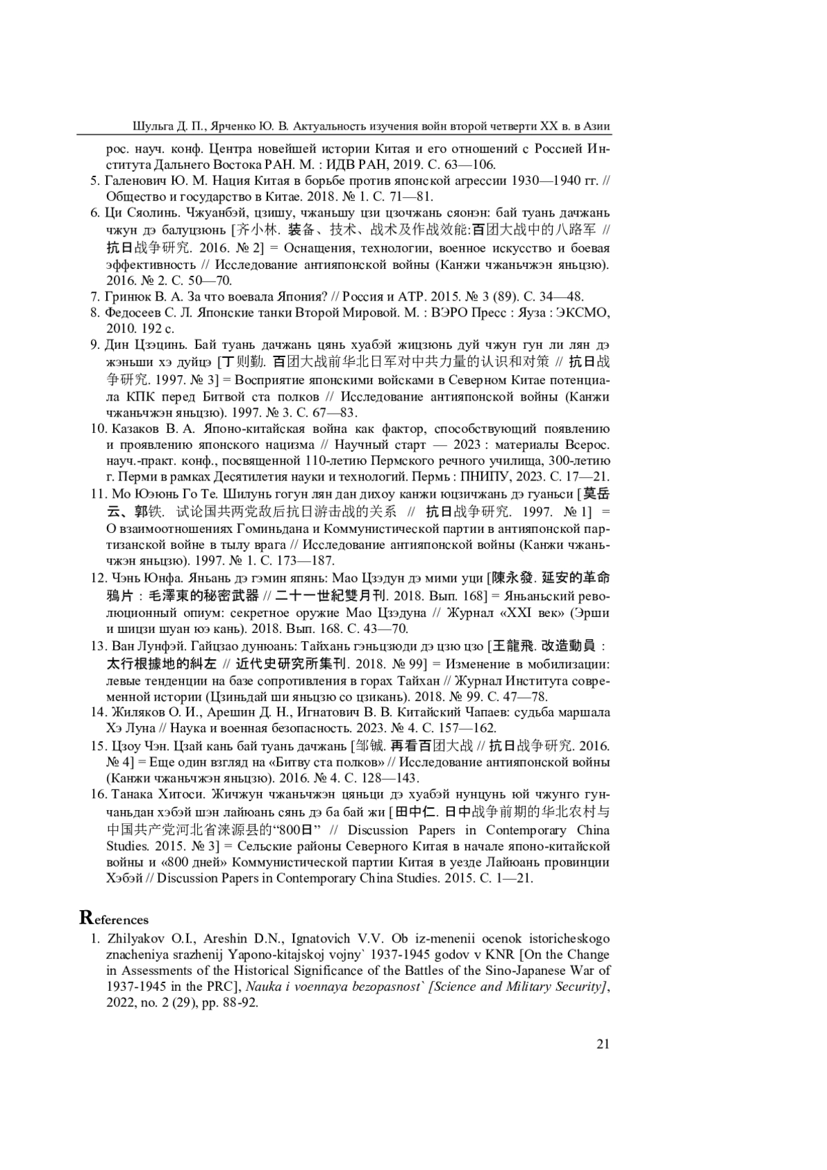 1. Жиляков О. И., Арешин Д. Н., Игнатович В. В. Об изменении оценок исторического значения сражений Японо-китайской войны 1937-1945 годов в КНР // Наука и военная безопасность. 2022. № 2 (29). С. 88-92.