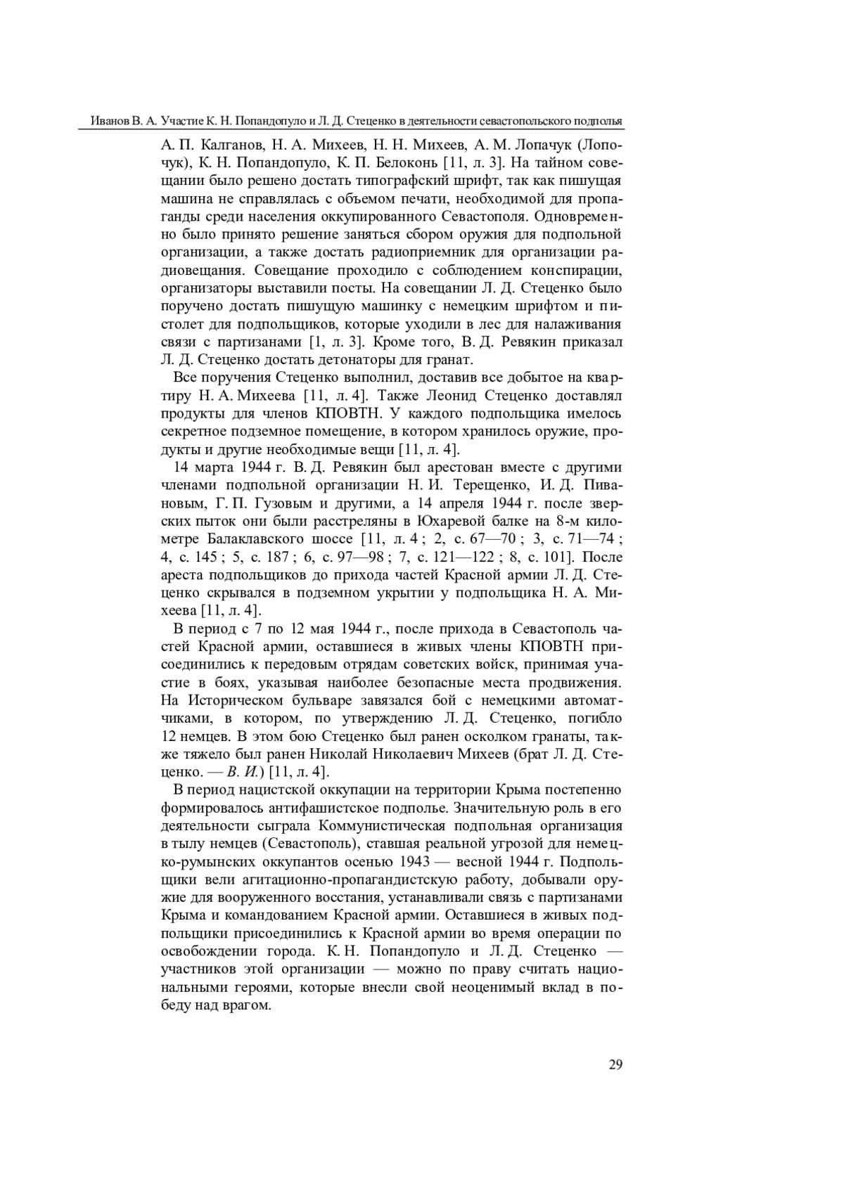 В статье на основе архивных материалов доказано участие К. Н. Попандопуло и Л. Д. Стеценко в деятельности Коммунистической подпольной организации в тылу немцев (КПОВТН) в оккупированном Севастополе в годы Великой Отечественной войны. Автор повествует о том, как К. Н. Попандопуло и Л. Д. Стеценко, одни из многих безвестных героев войны, присоединились к севастопольскому подполью, выполняли задания организации. Также говорится об их судьбе после раскрытия и разгрома КПОВТН в марте—апреле 1944 г. Автор констатирует, что деятельность подпольщиков заключалась в агитационно-пропагандистской работе (распространение листовок), в установлении контактов с партизанами Крыма и командованием Красной армии, а также в добыче оружия для подготовки вооруженного восстания. Отмечен вклад подпольщиков в общее дело антифашистской борьбы и создание условий для освобождения полуострова от немецко-румынской оккупации весной 1944 г. Статья написана на основании впервые вводимых в научный оборот источников из фондов Государственного архива Республики Крым. Также в статье использованы материалы советской периодической печати и отечественные публикации.