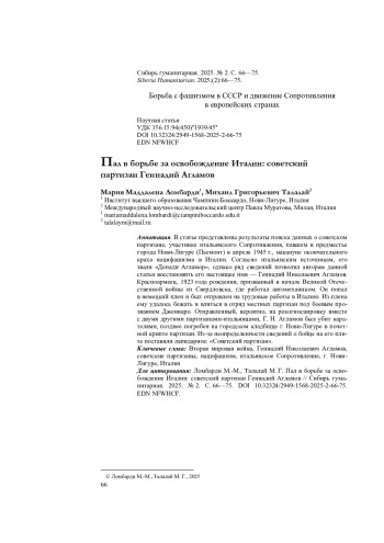 Итальянское движение Сопротивления как феномен Второй мировой войны возникло в период падения режима Муссолини в ответ на последовавшее за ним вторжение нацистской Германии на Апеннинский полуостров, а также постепенное продвижение англо-американских союзников на север полуострова после высадки на Сицилии. Часть бывших военнослужащих Королевской итальянской армии и представители гражданского населения объединились в вооруженные отряды на основе неприятия нацифашизма, идеологии, характеризующейся политическим и идеологическим сближением фашизма и нацизма, начавшемся в 1930-х гг. Именно к этим отрядам примкнули советские люди, преимущественно бежавшие военнопленные и дезертировавшие восточные легионеры. В общей сложности в рядах Сопротивления насчитывалось около 6 тыс. советских бойцов, т. е. около половины иностранного контингента Сопротивления, не менее полутысячи человек погибло. Многие из них получили награды от итальянского государства.