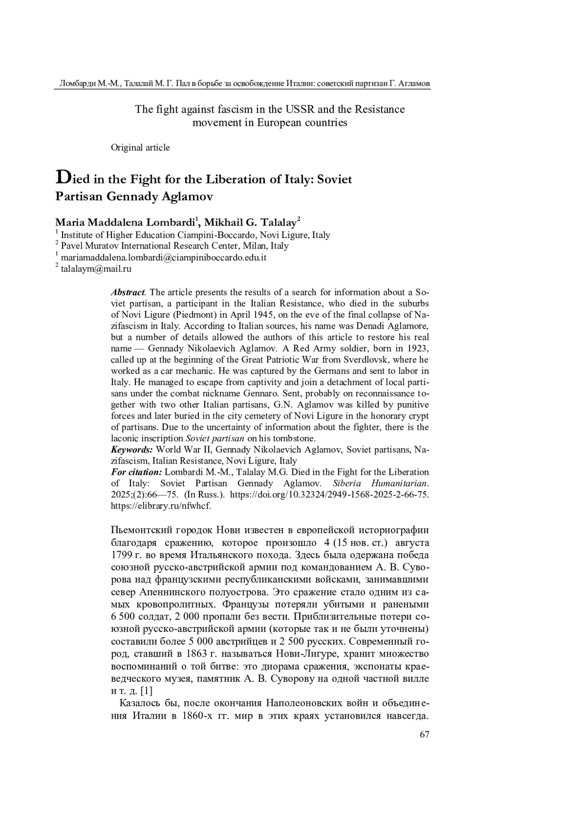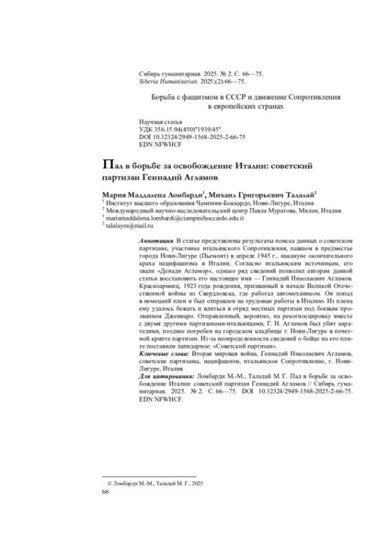 В статье представлены результаты поиска данных о советском партизане, участнике итальянского Сопротивления, павшем в предместье города Нови-Лигуре (Пьемонт) в апреле 1945 г., накануне окончательного краха нацифашизма в Италии. Согласно итальянским источникам, его звали «Денади Агламор», однако ряд сведений позволил авторам данной статьи восстановить его настоящее имя — Геннадий Николаевич Агламов. Красноармеец, 1923 года рождения, призванный в начале Великой Отечественной войны из Свердловска, где работал автомехаником. Он попал в немецкий плен и был отправлен на трудовые работы в Италию. Из плена ему удалось бежать и влиться в отряд местных партизан под боевым прозванием Дженнаро. Отправленный, вероятно, на рекогносцировку вместе с двумя другими партизанами-итальянцами, Г. Н. Агламов был убит карателями, позднее погребен на городском кладбище г. Нови-Лигуре в почетной крипте партизан. Из-за неопределенности сведений о бойце на его плите поставили лапидарное: «Советский партизан».