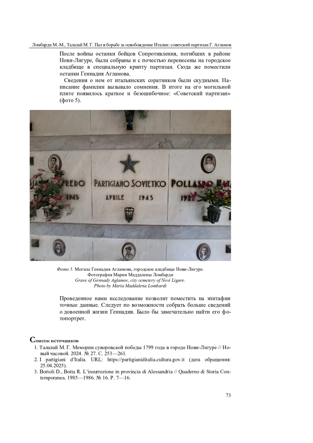 1. Талалай М. Г. Мемории суворовской победы 1799 года в городе Нови-Лигуре // Новый часовой. 2024. № 27. С. 253-261.