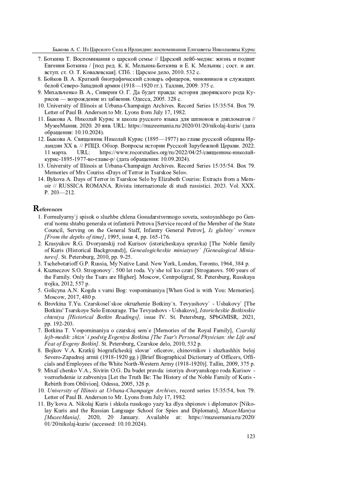 14. Bykova A. Days of Terror in Tsarskoe Selo by Elizabeth Couriss: Extracts from a Memoir // RUSSIcA ROMANA. Rivista internazionale di studi russistici. 2023. Vol. XXX. P. 203-212.