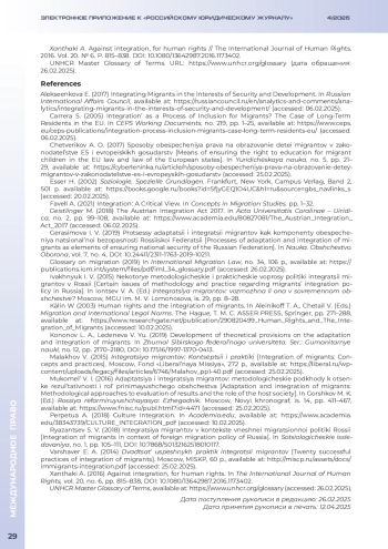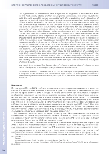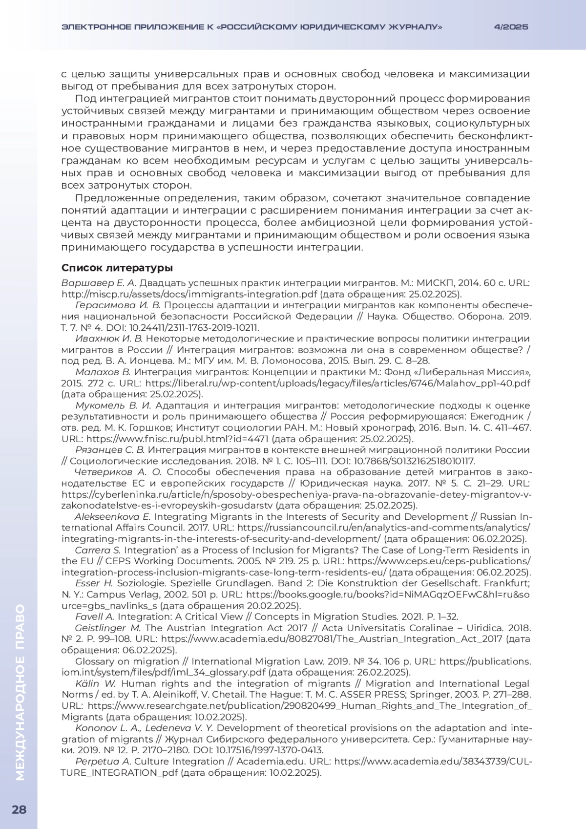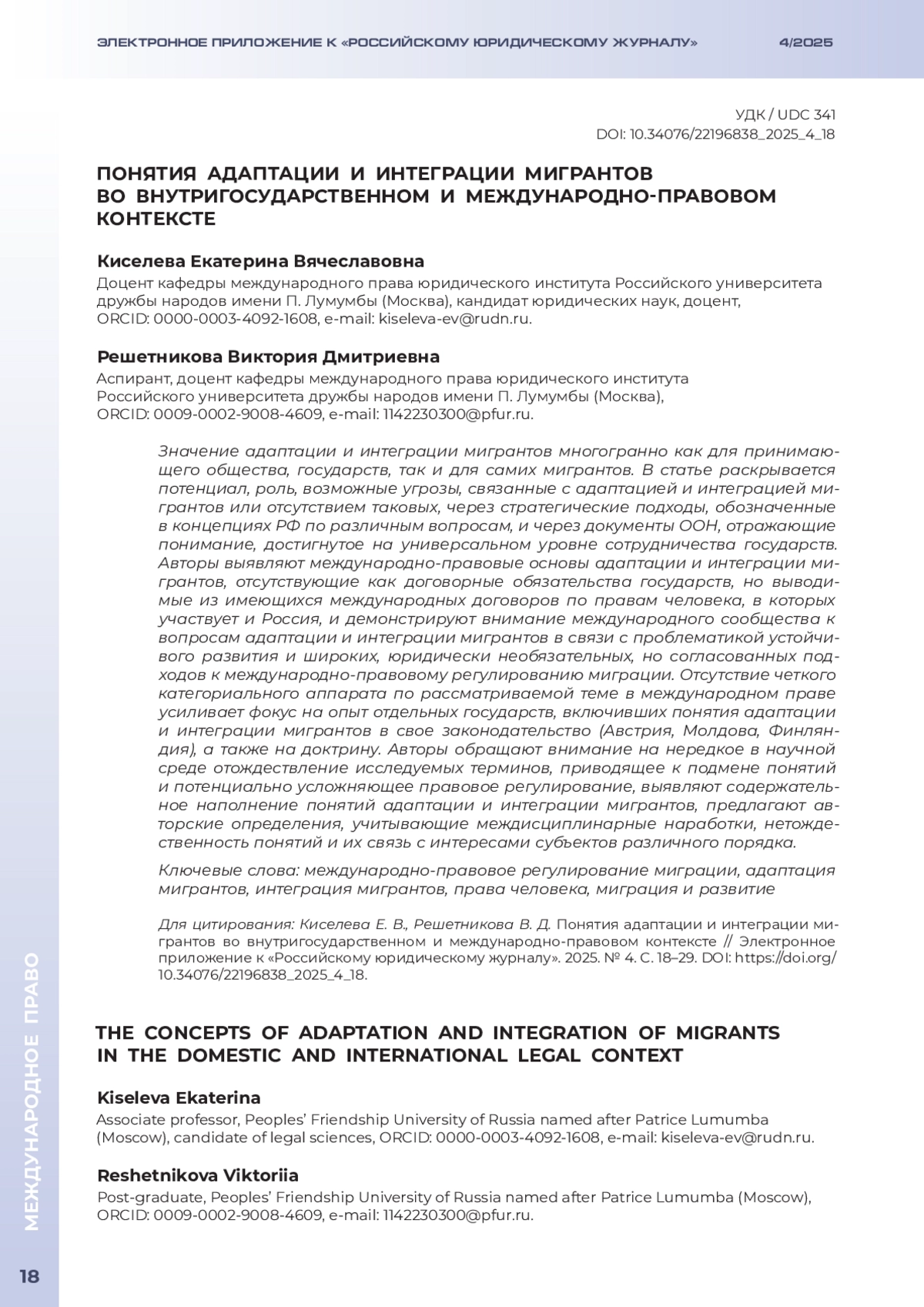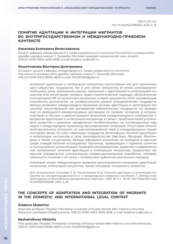 КИСЕЛЕВА Е. В., РЕШЕТНИКОВА В. Д. ПОНЯТИЯ АДАПТАЦИИ И ИНТЕГРАЦИИ МИГРАНТОВ ВО ВНУТРИГОСУДАРСТВЕННОМ И МЕЖДУНАРОДНО-ПРАВОВОМ КОНТЕКСТЕ // ЭЛЕКТРОННОЕ ПРИЛОЖЕНИЕ К РОССИЙСКОМУ ЮРИДИЧЕСКОМУ ЖУРНАЛУ. 2025. № 4