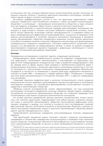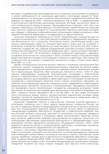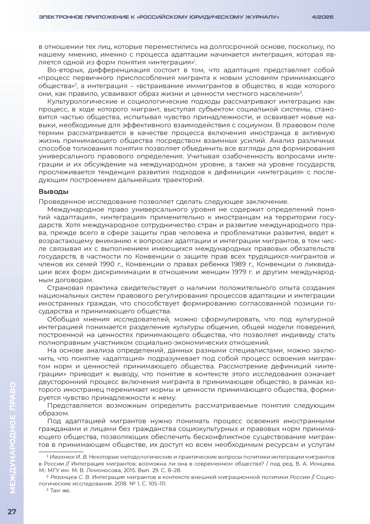 Статья: ПОНЯТИЯ АДАПТАЦИИ И ИНТЕГРАЦИИ МИГРАНТОВ ВО ВНУТРИГОСУДАРСТВЕННОМ И МЕЖДУНАРОДНО-ПРАВОВОМ КОНТЕКСТЕ (2025)