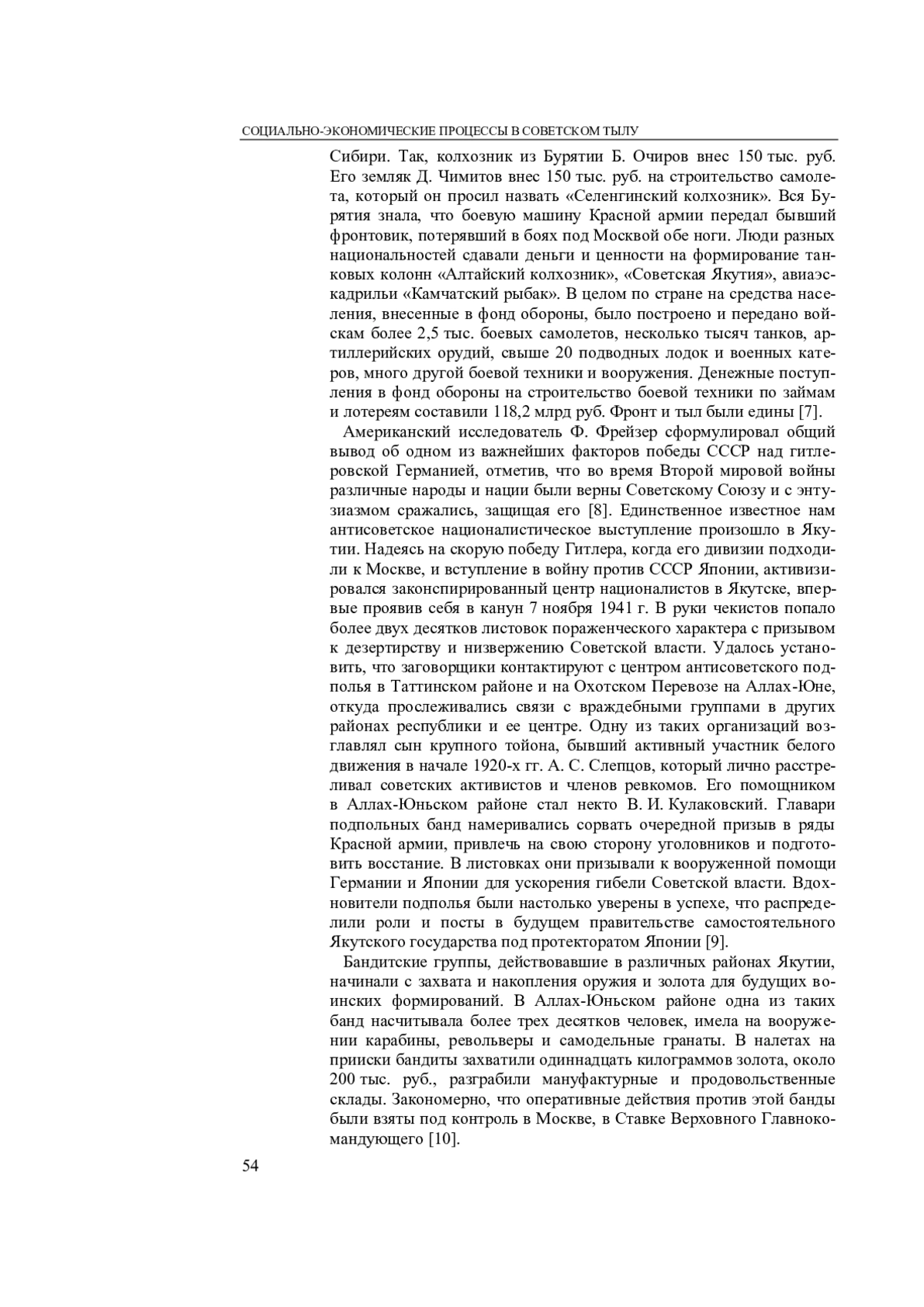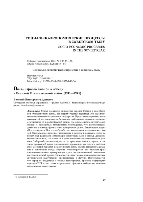 Статья посвящена инициативе народов Сибири в ходе Великой Отечественной войны. На защиту Родины поднялось все население многонационального советского государства. Представители разных национальностей, не дожидаясь мобилизации, добровольно подавали заявления о зачислении их в ряды Красной армии. На основе анализа исторических фактов и проводимых мероприятий утверждается, что патриотическое движение в помощь фронту стало всенародным делом. Выдвинутый лозунг «Все для фронта! Все для победы!» стал выражением воли советских людей. Описываются народные инициативы в регионе в контексте курса на победу над фашизмом (организация фронтовых смен и бригад, движение многостаночников). Колхозники и работники совхозов национальных рай-онов Сибири обеспечивали фронт и тыл продовольствием и сырьем, в том числе продукцией таких традиционных промыслов, как охота и рыболовство. Всеобщий характер с самого начала войны носило движение за создание и пополнение фонда обороны. Констатируется, что надежды врага и немногочисленных приверженцев курса на национальный антагонизм потерпели полный провал. Описывается единственное националистическое антисоветское выступление, произошедшее в Якутии. Подчеркивается, что народ не поддержал и осудил авантюристов. Братское содружество народов СССР стало одним из решающих факторов победы над немецко-фашистскими захватчиками.