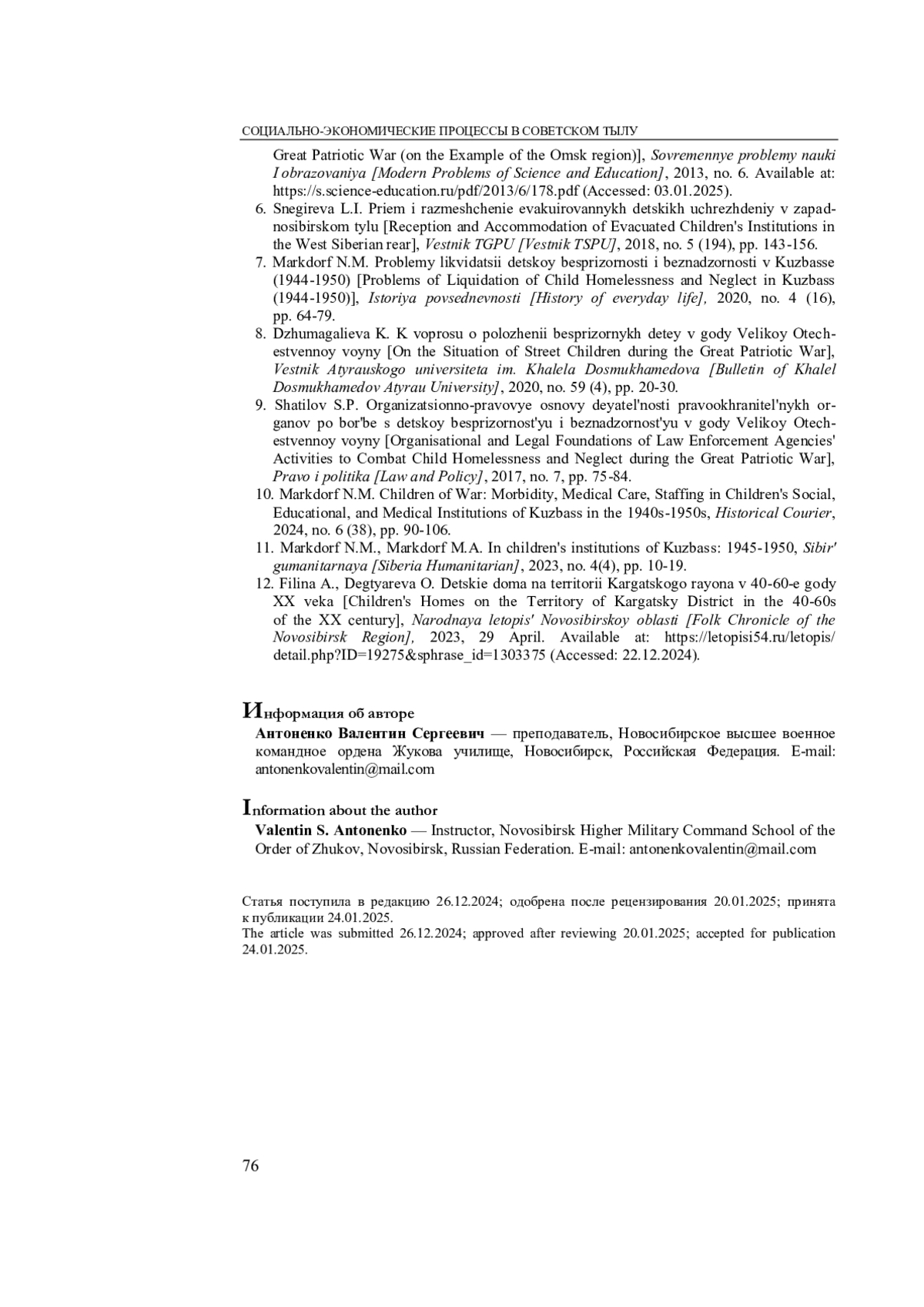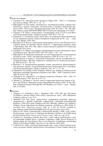 10. Markdorf N. M. Children of War: Morbidity, Medical Care, Staffing in Children’s Social, Educational, and Medical Institutions of Kuzbass in the 1940s-1950s // Historical Courier. 2024. № 6 (38). P. 90-106.