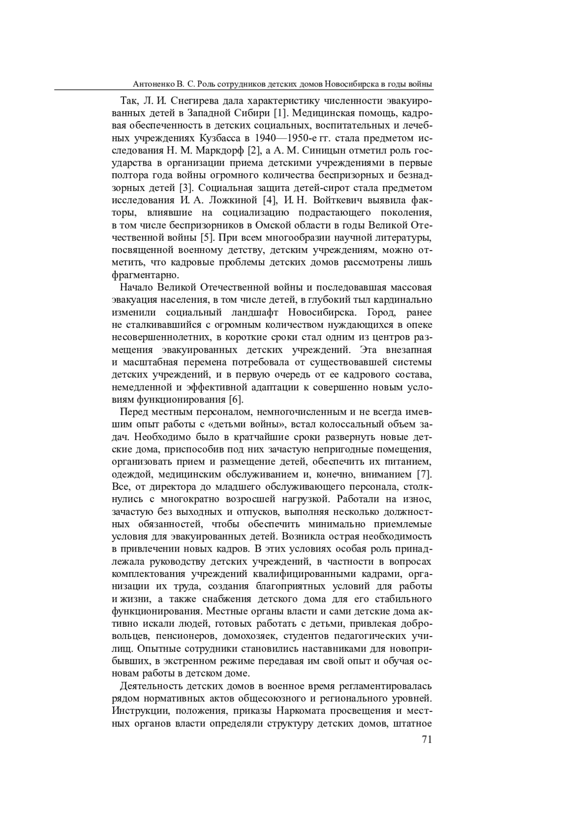 6. Снегирева Л. И. Прием и размещение эвакуированных детских учреждений в западносибирском тылу // Вестник ТГПУ. 2018. № 5 (194). С. 143-156.
