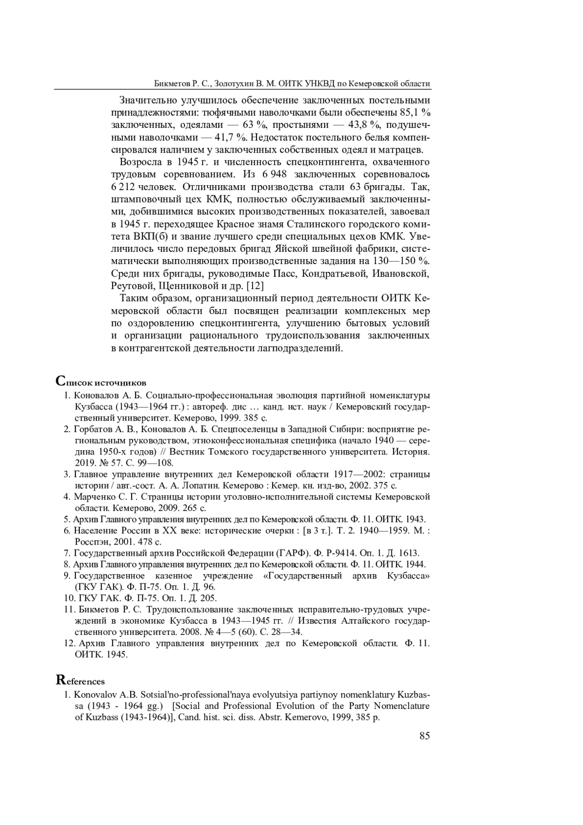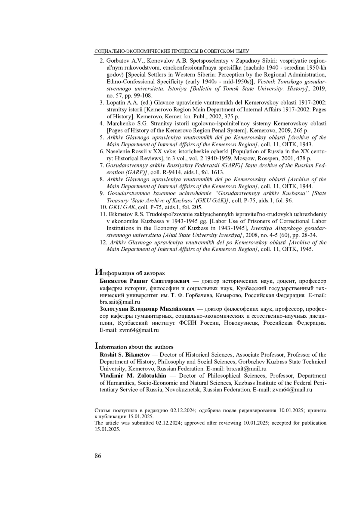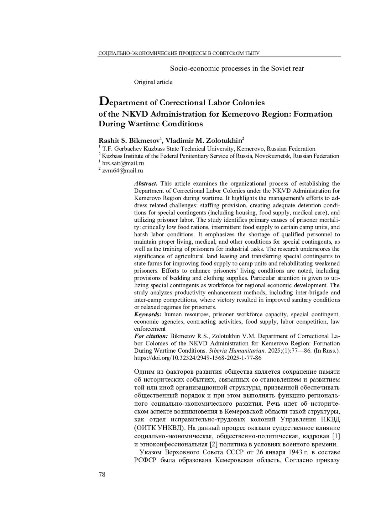 БИКМЕТОВ Р. С., ЗОЛОТУХИН В. М. ОТДЕЛ ИСПРАВИТЕЛЬНО-ТРУДОВЫХ КОЛОНИЙ УПРАВЛЕНИЯ НКВД ПО КЕМЕРОВСКОЙ ОБЛАСТИ: СТАНОВЛЕНИЕ В УСЛОВИЯХ ВОЕННОГО ВРЕМЕНИ // СИБИРЬ ГУМАНИТАРНАЯ. 2025. № 1 (9)
