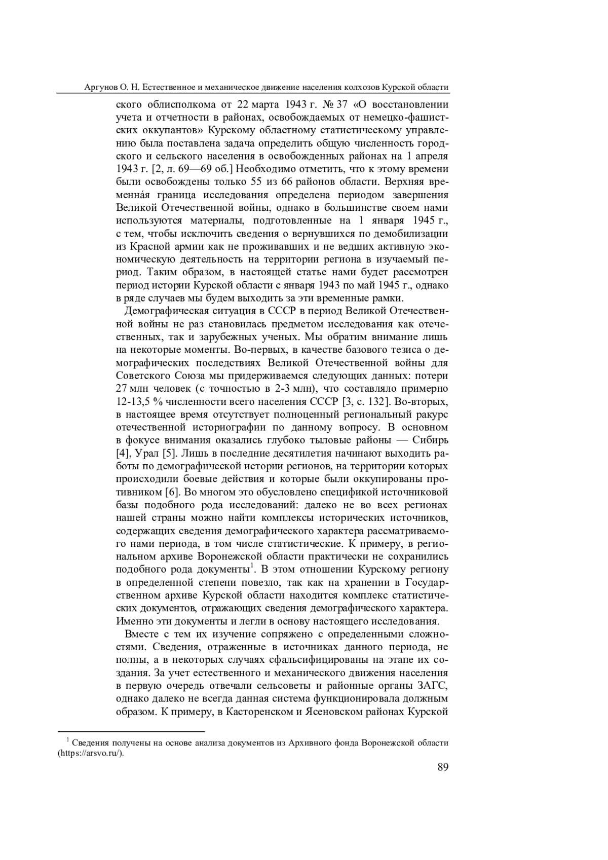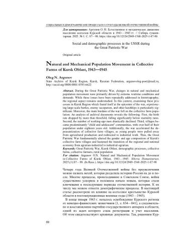 В годы Великой Отечественной войны изменения в естественном и механическом движении населения были обусловлены преимущественно экстремальными условиями и потребностями войны. Несмотря на то, что в историографии данные вопросы неоднократно поднимались и всесторонне рассматривались, региональный аспект остается малоизученным. В этой связи интересным представляется изучение данных процессов на материалах Курского региона, который оказался в эпицентре войны: на его территории происходили масштабные боевые действия, область оккупировалась противником и пр. Более того, основные тяготы войны легли на плечи колхозного населения. Анализ архивных документов показывает следующее: во-первых, рождаемость снижается более чем в три раза и становится значительно ниже показателей смертности; во-вторых, существенно сокращается количество мужчин трудоспособного возраста; в-третьих, деревня становится преимущественно «детской и подростковой»: более чем половине ее населения нет восемнадцати лет. Кроме того, война в значительной степени ускорила процесс раскрестьянивания колхозной деревни: молодежь отрывалась от сельскохозяйственного производства и направлялась на работу в промышленность. Таким образом, Великая Отечественная война коренным образом изменила половозрастной состав курской колхозной деревни и ускорила процесс перехода экономики области и страны от аграрно-индустриальной к индустриально-аграрной.