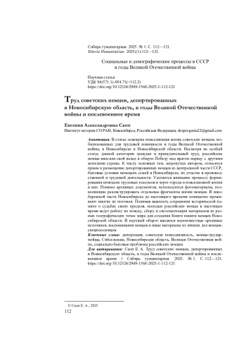 В статье освещена повседневная жизнь советских немцев, мобилизованных для трудовой повинности в годы Великой Отечественной войны, в Новосибирске и Новосибирской области. Несмотря на особый статус данной категории граждан и принудительный труд, российские немцы вносили свой вклад в общую Победу над врагом наряду с другими жителями страны. К числу основных тем, затронутых автором, относится прием и размещение депортированных немцев из центральной части СССР, бытовые условия немецких семей в Новосибирске, их участие в производственной и трудовой деятельности. Уделяется внимание процессу формирования немецких трудовых поселков в черте города и повседневной жизни в них. Помимо архивных документов, используются фотоматериалы, позволяющие реконструировать отдельные фрагменты жизни немцев. В лево-бережной части Новосибирска до настоящего времени компактно проживают многие их потомки. Понимая важность сохранения исторической памяти о судьбах своих предков, молодые российские немцы в настоящее время ведут работу по поиску, сбору и систематизации материалов из разных географических точек мира для создания Книги памяти немцев Новосибирской области. В научный оборот вводятся малоизвестные архивные источники, воспоминания немцев и иные материалы из личных дел немцев-спецпоселенцев.