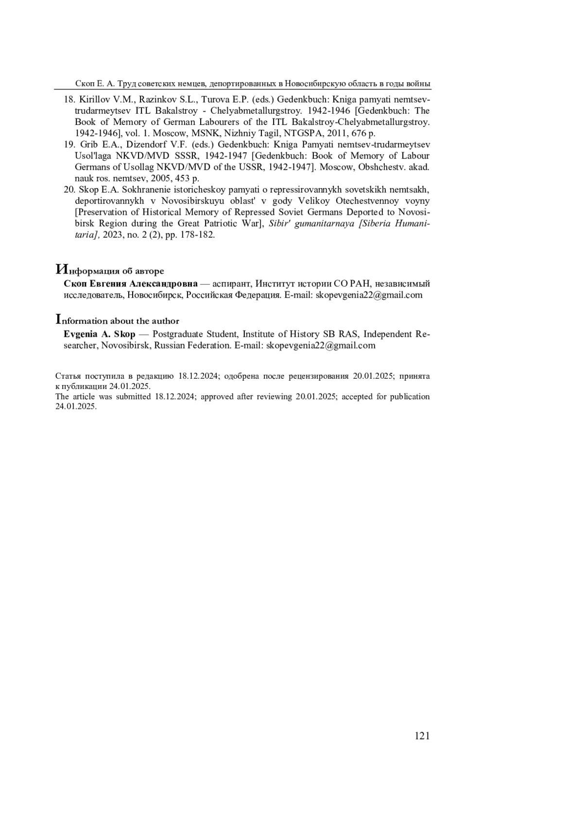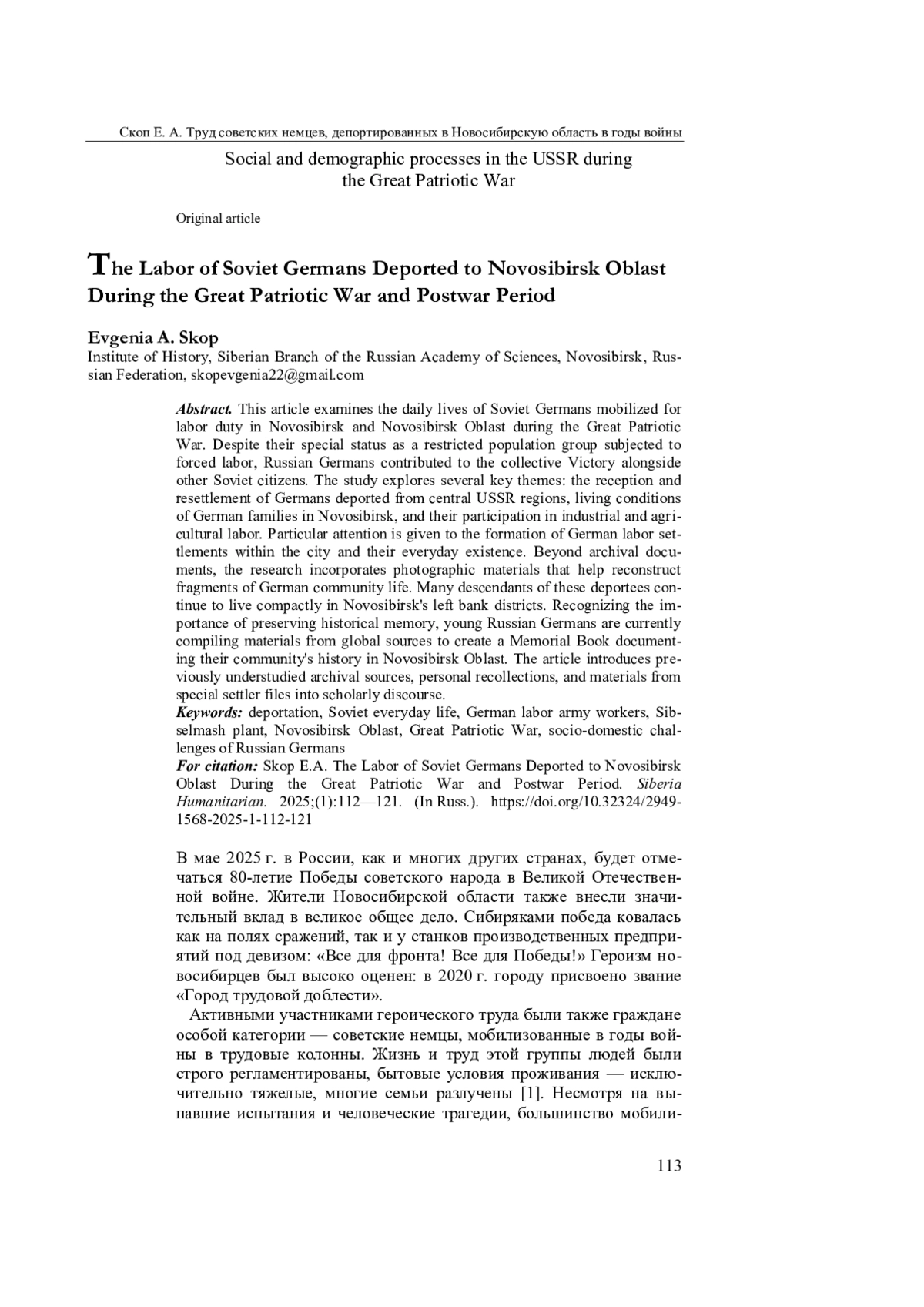 СКОП Е. А. ТРУД ВАННЫХ В НОВОСИБИРСКУЮ ОБЛАСТЬ, В ГОДЫ ВЕЛИКОЙ ОТЕЧЕСТВЕННОЙ ВОЙНЫ И ПОСЛЕВОЕННОЕ ВРЕМЯ // СИБИРЬ ГУМАНИТАРНАЯ. 2025. № 1 (9)