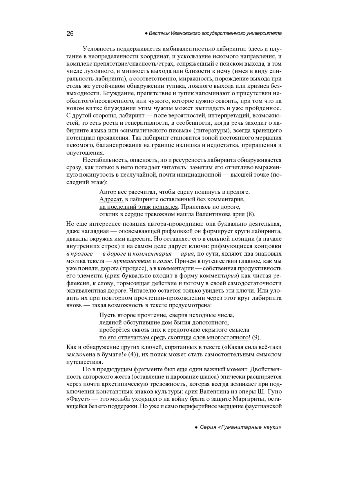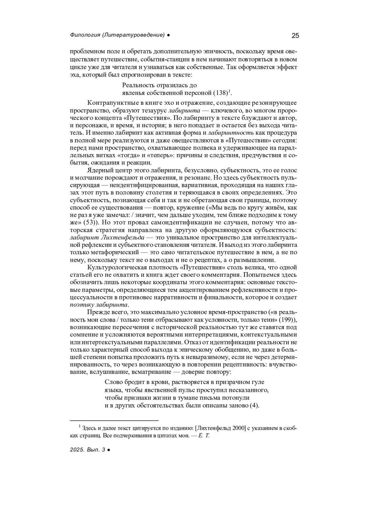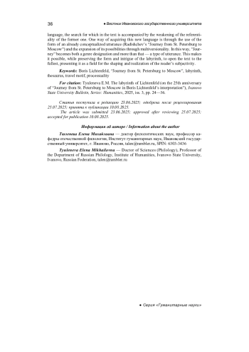 Статья посвящена осмыслению знакового произведения в поэтическом корпусе Б. Е. Лихтенфельда, во многом определяющего его эстетические принципы и поэтику. «Путешествие из Петербурга в Москву в изложении Бориса Лихтенфельда», рассматриваемое в своей юбилейной точке, предстает активно резонирующим с современностью и вместе с тем эпически ее предваряющим. Книга, имеющая синтетическую жанровую природу и сложно организованную структуру, представляется неким многоверсионным пространством для размышления. В попытке выработать подходы к анализу текста предлагается исходить из его ключевого концепта «лабиринт» и, соответственно, «лабиринтного высказывания», определяющегося акцентированием рефлексивности и процессуальности в противовес нарративности и финальности. Этот ракурс позволяет выявить и описать основные текстовые параметры: условное время-пространство, отказ от верификации реальности; амбивалентность лабиринта (тупиковость — ресурсность); тезаурус как основной принцип организации с его сосредоточением на процессуальной плотности и веществе текста-лабиринта; пульсирующая субъектность, ускользающая от идентификации. Вскрывается свойственная поэтике лабиринта потребность в ином типе языка, поиск которого в тексте сопровождается наблюдением за ослаблением референциальности прежнего. Одним из способов обретения нового языка является использование формы уже концептуализированного высказывания (радищевского «Путешествия») и расширение его возможностей через поливерсионность. Так «Путешествие» становится и жанровым определением, и больше — типом высказывания. Это позволяет, сохраняя форму и интригу лабиринта, максимально открыть текст, представив его полем для оформления/реализации читательской субъектности.
