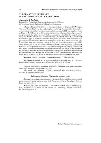 Статья посвящена исследованию тишины в пьесе Т. Уильямса «Орфей спускается в ад», а также в его последующих пьесах, содержащих элементы орфического сюжета. Проведено сравнение семантики молчания у драматургов начала XX века и Уильямса с целью определения возможного влияния. Выявлено несколько функций использования тишины в пьесе, в связи с чем проведено разделение исследуемого предмета на абсолютное молчание и молчание, наполненное музыкой. Определено, что первый вид молчания оказывается связан со смертью и исходит от персонажей, олицетворяющих собой Аида и обитателей царства мертвых, тогда как второй вид связан с внутренней свободой, родством душ, поиском ответов на вопросы об устройстве жизни и исходит от героев, являющихся метафорическими Орфеем и Эвридикой. В качестве образа-символа, сопровождающего молчание, наполненное музыкой, исследован образ птицы. Сделаны выводы о том, что возможность петь как одна из отличительных функций птиц выделяет главных героев среди других персонажей и наделяет их некоторой внутренней силой, позволяющей бороться с жизненными трудностями, в то время как утрата возможности петь или отказ от этой возможности приводит к духовной и физической гибели.