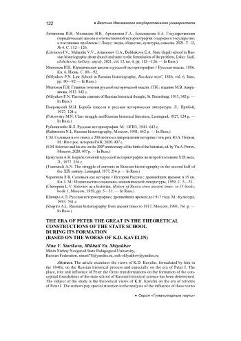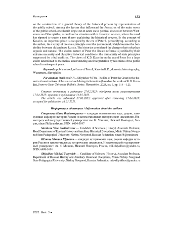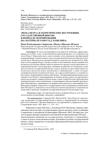 СТАРИКОВА Н. В., ШЛЯХОВ М. Ю. ЭПОХА ПЕТРА I В ТЕОРЕТИЧЕСКИХ ПОСТРОЕНИЯХ ГОСУДАРСТВЕННОЙ ШКОЛЫ В ПЕРИОД ЕЕ ФОРМИРОВАНИЯ (НА МАТЕРИАЛЕ РАБОТ К. Д. КАВЕЛИНА) // ВЕСТНИК ИВАНОВСКОГО ГОСУДАРСТВЕННОГО УНИВЕРСИТЕТА. СЕРИЯ: ГУМАНИТАРНЫЕ НАУКИ. 2025. № 3