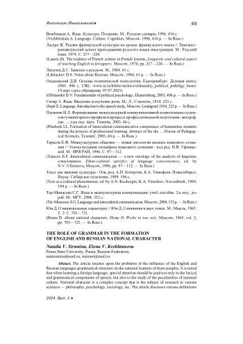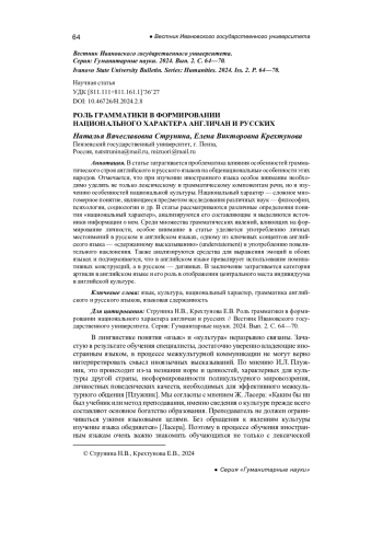 СТРУНИНА Н. В., КРЕХТУНОВА Е. В. РОЛЬ ГРАММАТИКИ В ФОРМИРОВАНИИ НАЦИОНАЛЬНОГО ХАРАКТЕРА АНГЛИЧАН И РУССКИХ // ВЕСТНИК ИВАНОВСКОГО ГОСУДАРСТВЕННОГО УНИВЕРСИТЕТА. СЕРИЯ: ГУМАНИТАРНЫЕ НАУКИ. 2024. № 2