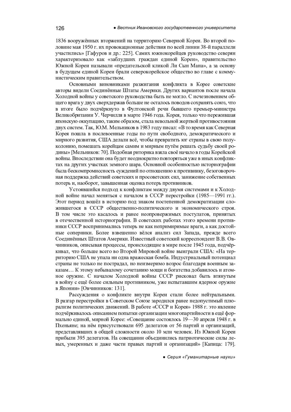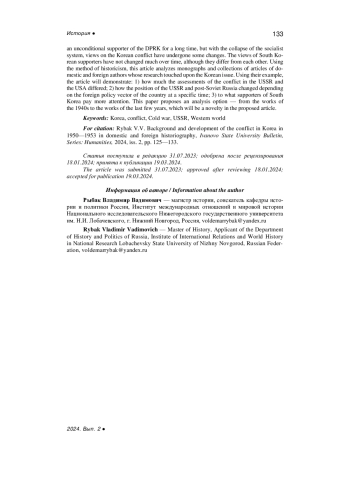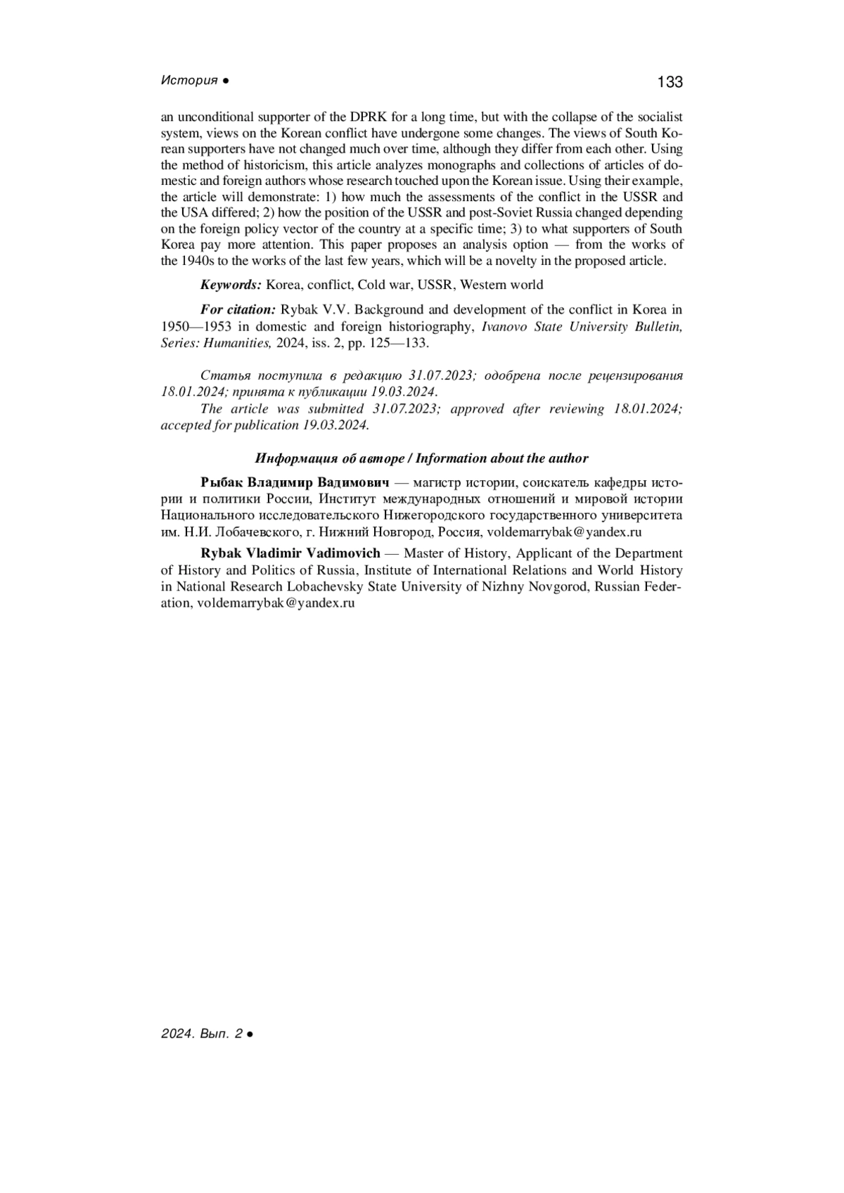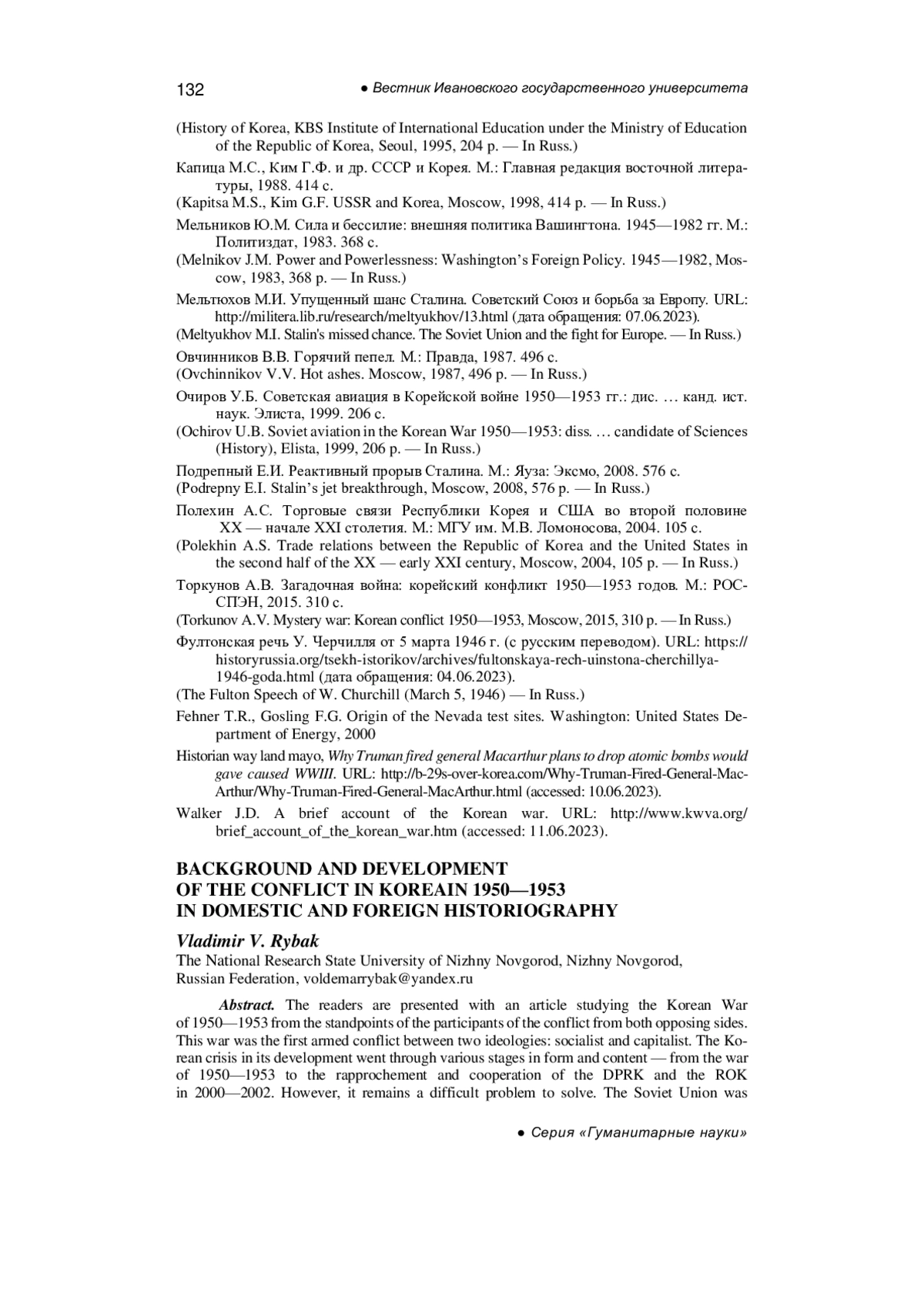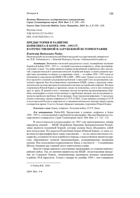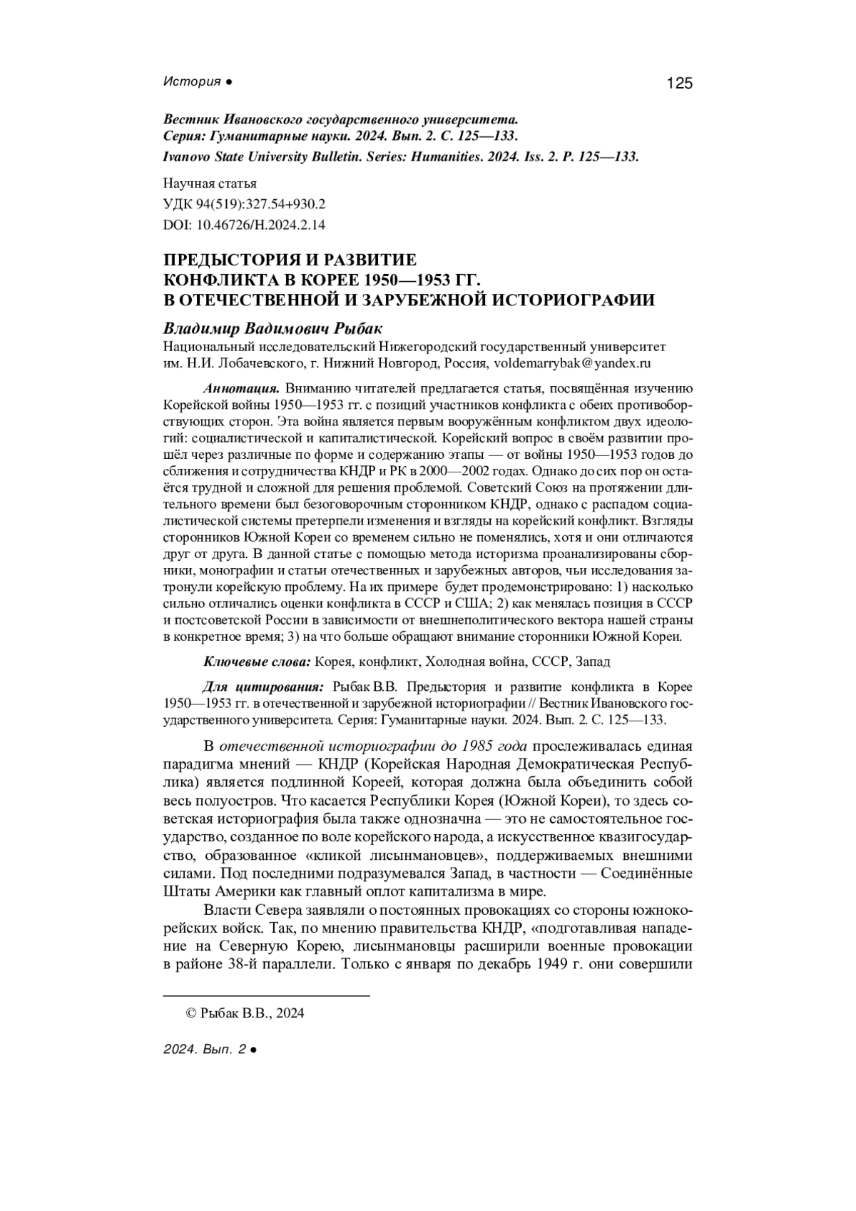РЫБАК В. В. ПРЕДЫСТОРИЯ И РАЗВИТИЕ КОНФЛИКТА В КОРЕЕ 1950-1953 ГГ. В ОТЕЧЕСТВЕННОЙ И ЗАРУБЕЖНОЙ ИСТОРИОГРАФИИ // ВЕСТНИК ИВАНОВСКОГО ГОСУДАРСТВЕННОГО УНИВЕРСИТЕТА. СЕРИЯ: ГУМАНИТАРНЫЕ НАУКИ. 2024. № 2
