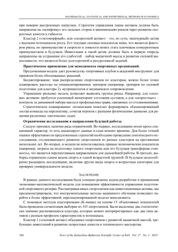 Заключение. Работа демонстрирует, что применение математических методов позволяет перейти от интуитивного управления к научно обоснованному менеджменту спортивных активов, повышая общую эффективность деятельности спортивных организаций.
