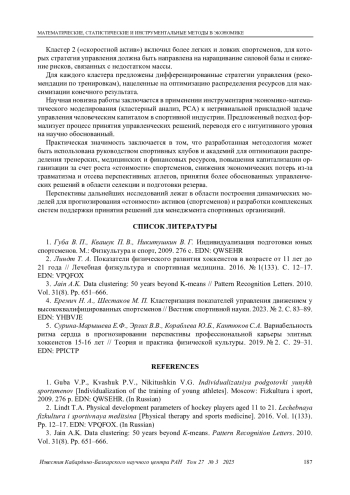 Результаты. На основе выборки из 103 спортсменов, охарактеризованных по 15 объективным параметрам, с помощью алгоритма K-means были выделены две гомогенные группы (кластеры) активов. Статистический анализ (ANOVA) подтвердил значимые различия между группами, что позволяет интерпретировать их как два типа активов с разным потенциалом и рисками. Для каждого кластера разработаны дифференцированные стратегии управления (тренировочные программы), направленные на максимизацию их «стоимости» (спортивного потенциала) и минимизацию рисков (травматизм, отсев).