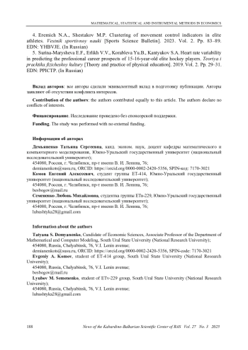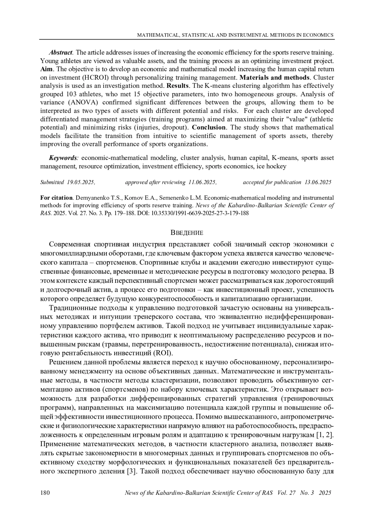 ДЕМЬЯНЕНКО Т. С., КОМОВ Е. А., СЕМЕНЕНКО Л. М. ЭКОНОМИКО-МАТЕМАТИЧЕСКОЕ МОДЕЛИРОВАНИЕ И ИНСТРУМЕНТАЛЬНЫЕ МЕТОДЫ ДЛЯ ПОВЫШЕНИЯ ЭФФЕКТИВНОСТИ ПОДГОТОВКИ СПОРТИВНОГО РЕЗЕРВА // ИЗВЕСТИЯ КАБАРДИНО-БАЛКАРСКОГО НАУЧНОГО ЦЕНТРА РАН. 2025. ТОМ 27 № 3