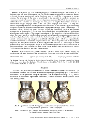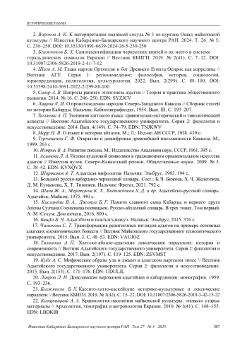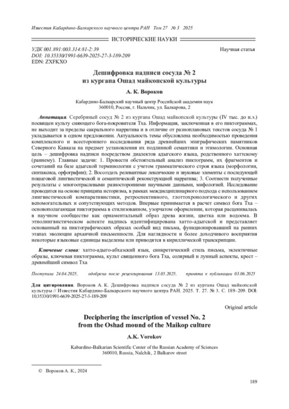2. Вороков А. К. К интерпретации надписей сосуда № 1 из кургана Ошад майкопской культуры // Известия Кабардино-Балкарского научного центра РАН. 2024. Т. 26. № 5. С. 230-250. DOI: 10.35330/1991-6639-2024-26-5-230-250 EDN: SIZXMZ