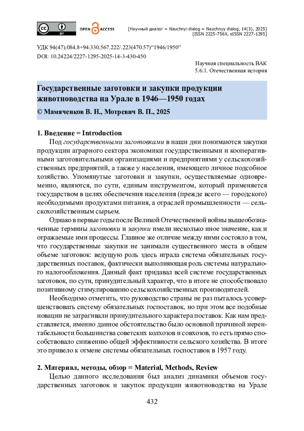 18. Мамяченков В. Н. Производство мяса в индивидуальном и общественном секторах сельского хозяйства Урала в 1946-1965 гг. / В. Н. Мамяченков, В. П. Мотревич // Известия высших учебных заведений. Поволжский регион. Гуманитарные науки. - 2024. - № 1 (69). - С. 42-54.