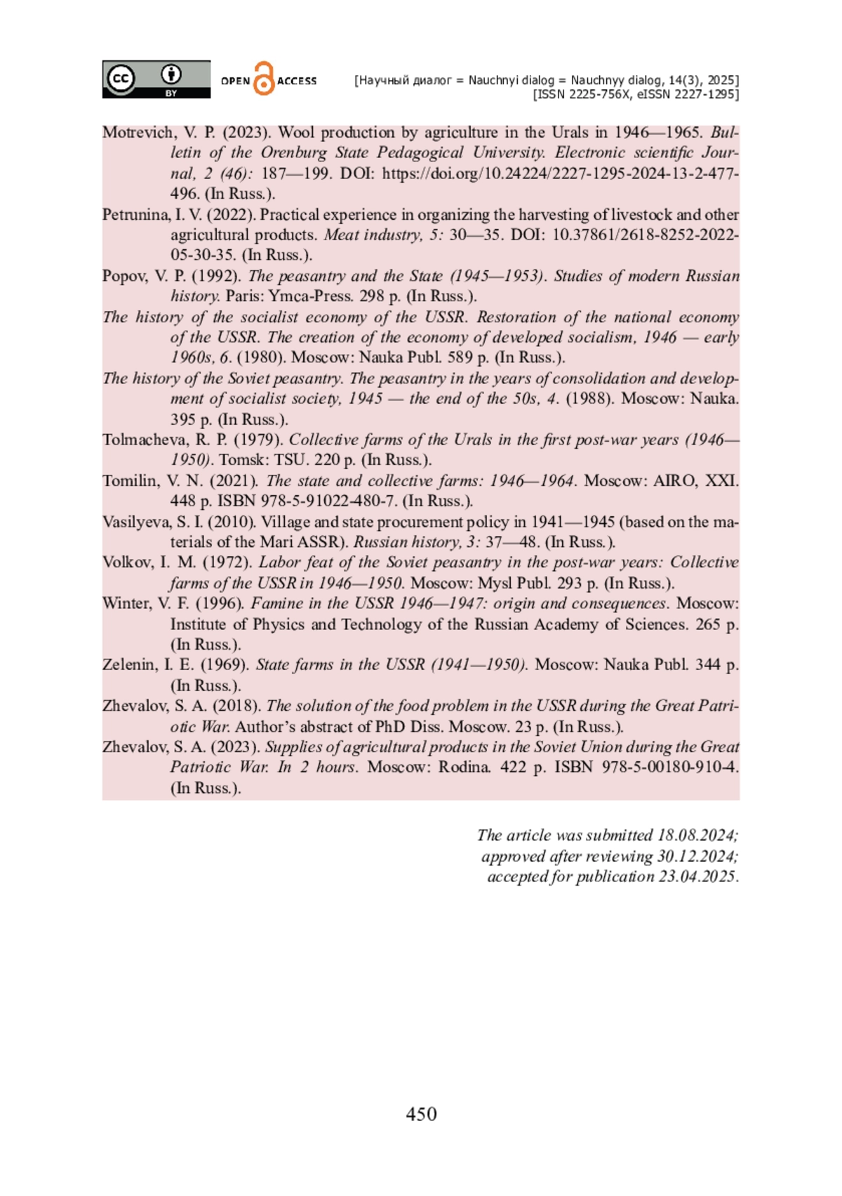 10. Жевалов С. А. Поставки сельхозпродукции в Советском Союзе в период Великой Отечественной войны. В 2-х ч. / С. А. Жевалов. - Москва : Родина, 2023. - 422 с. - ISBN 978-5-00180-910-4.