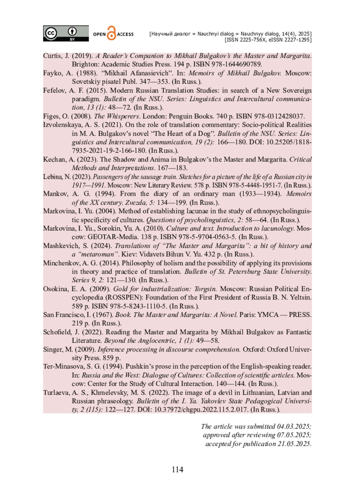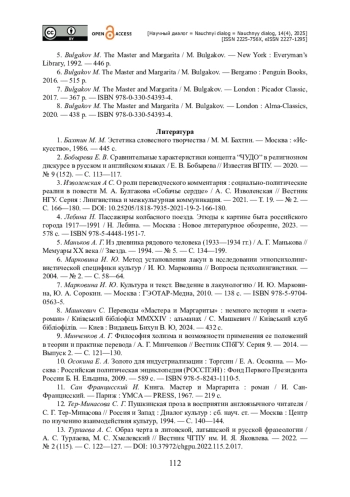 21. Schofield J. Reading the Master and Margarita by Mikhail Bulgakov as Fantastic Literature / J. Schofield // Beyond the Anglocentric. - 2022. - Vol. 1. - № 1. - Pp. 49-58.