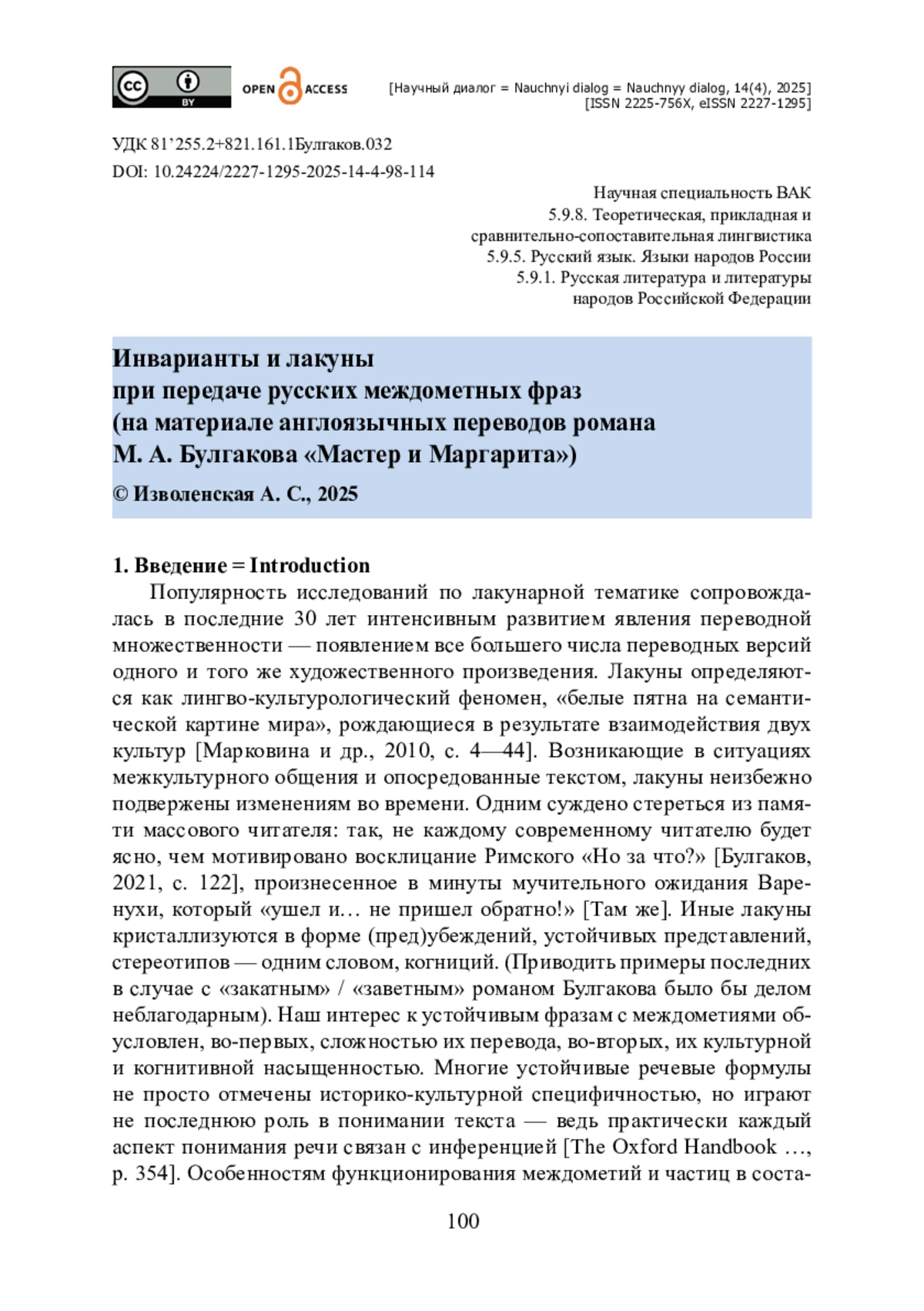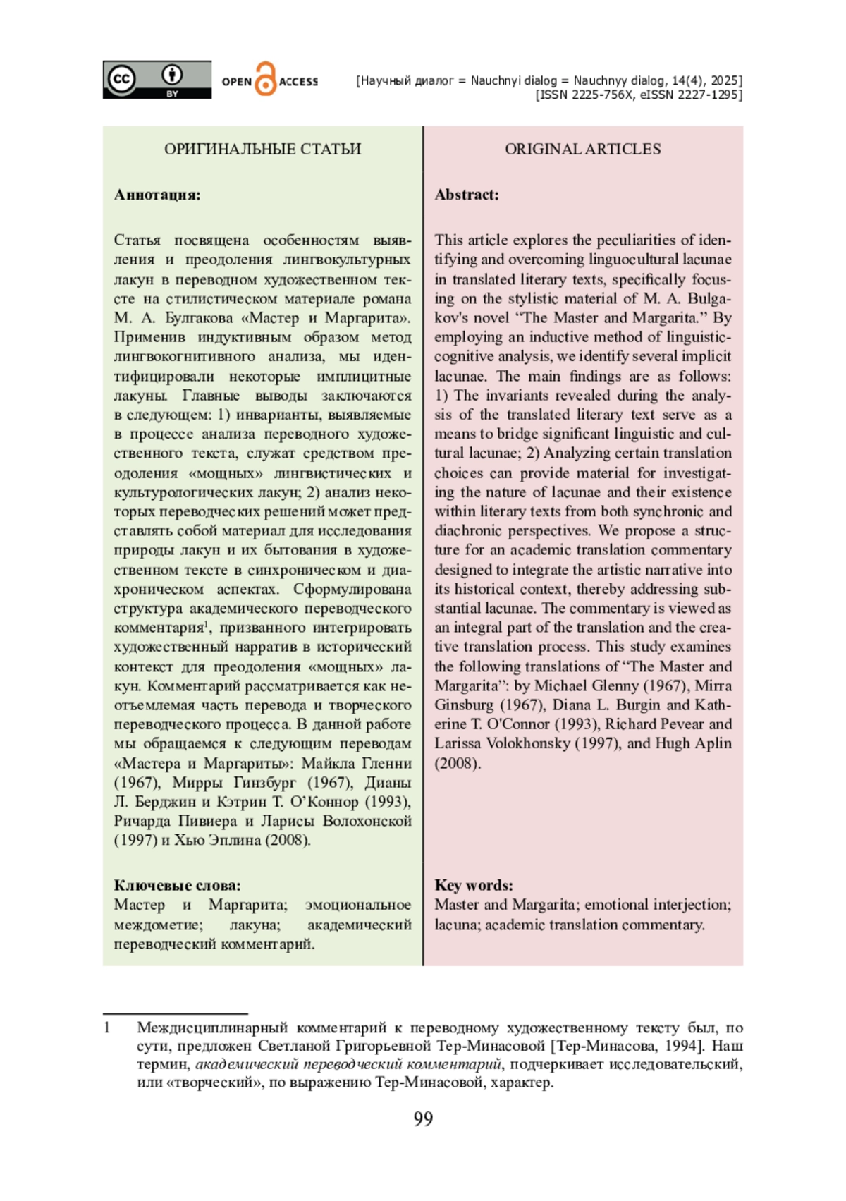 Статья посвящена особенностям выявления и преодоления лингвокультурных лакун в переводном художественном тексте на стилистическом материале романа М. А. Булгакова «Мастер и Маргарита». Применив индуктивным образом метод лингвокогнитивного анализа, мы идентифицировали некоторые имплицитные лакуны. Главные выводы заключаются в следующем: 1) инварианты, выявляемые в процессе анализа переводного художественного текста, служат средством преодоления «мощных» лингвистических и культурологических лакун; 2) анализ некоторых переводческих решений может представлять собой материал для исследования природы лакун и их бытования в художественном тексте в синхроническом и диахроническом аспектах. Сформулирована структура академического переводческого комментария, призванного интегрировать художественный нарратив в исторический контекст для преодоления «мощных» лакун. Комментарий рассматривается как неотъемлемая часть перевода и творческого переводческого процесса. В данной работе мы обращаемся к следующим переводам «Мастера и Маргариты»: Майкла Гленни (1967), Мирры Гинзбург (1967), Дианы Л. Берджин и Кэтрин Т. О’Коннор (1993), Ричарда Пивиера и Ларисы Волохонской (1997) и Хью Эплина (2008).