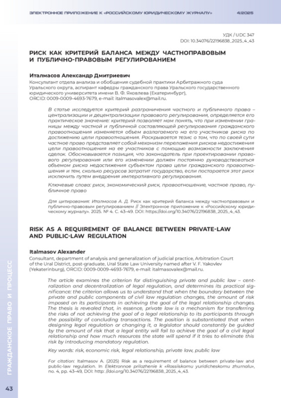 Тема поиска баланса между частноправовым и публично-правовым регулированием гражданских отношений является фундаментальной проблемой, которая приобрела особую актуальность в современной юридической науке. Находясь в поисках оптимального сочетания вмешательства государства в экономические отношения и свободы частной инициативы, ученые разрабатывают предложения по совершенствованию законодательства или изменению вектора развития судебной практики.