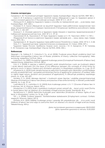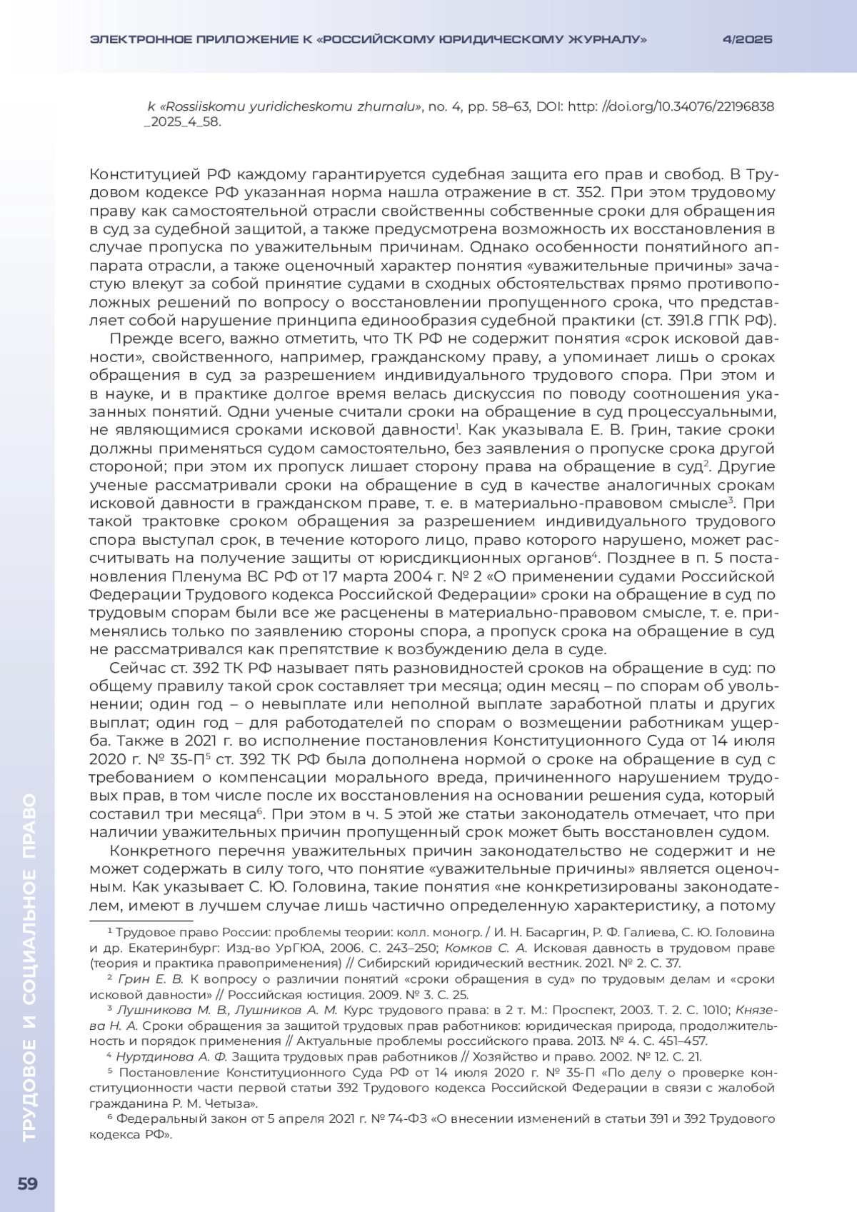 4. Князева Н. А. Сроки обращения за защитой трудовых прав работников: юридическая природа, продолжительность и порядок применения // Актуальные проблемы российского права. 2013. № 4. С. 451-457. EDN: PZNZJR