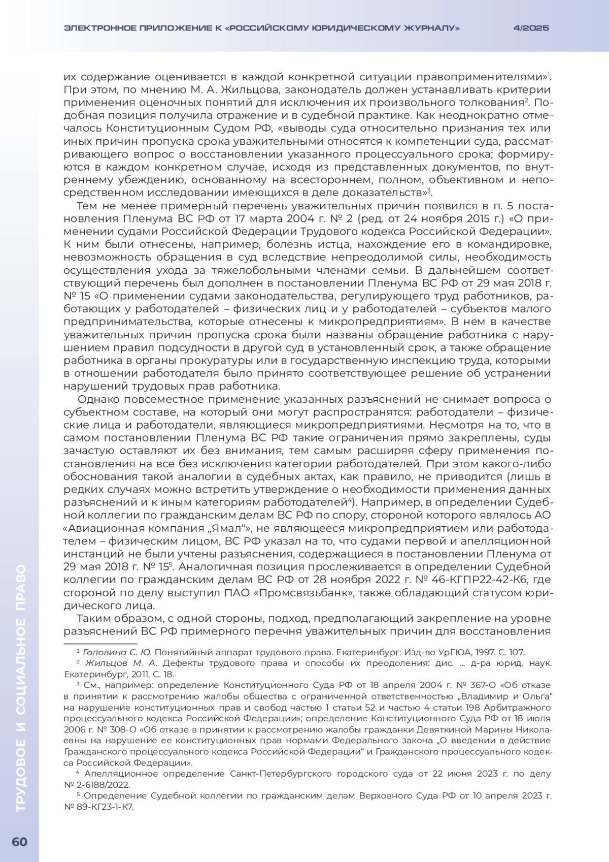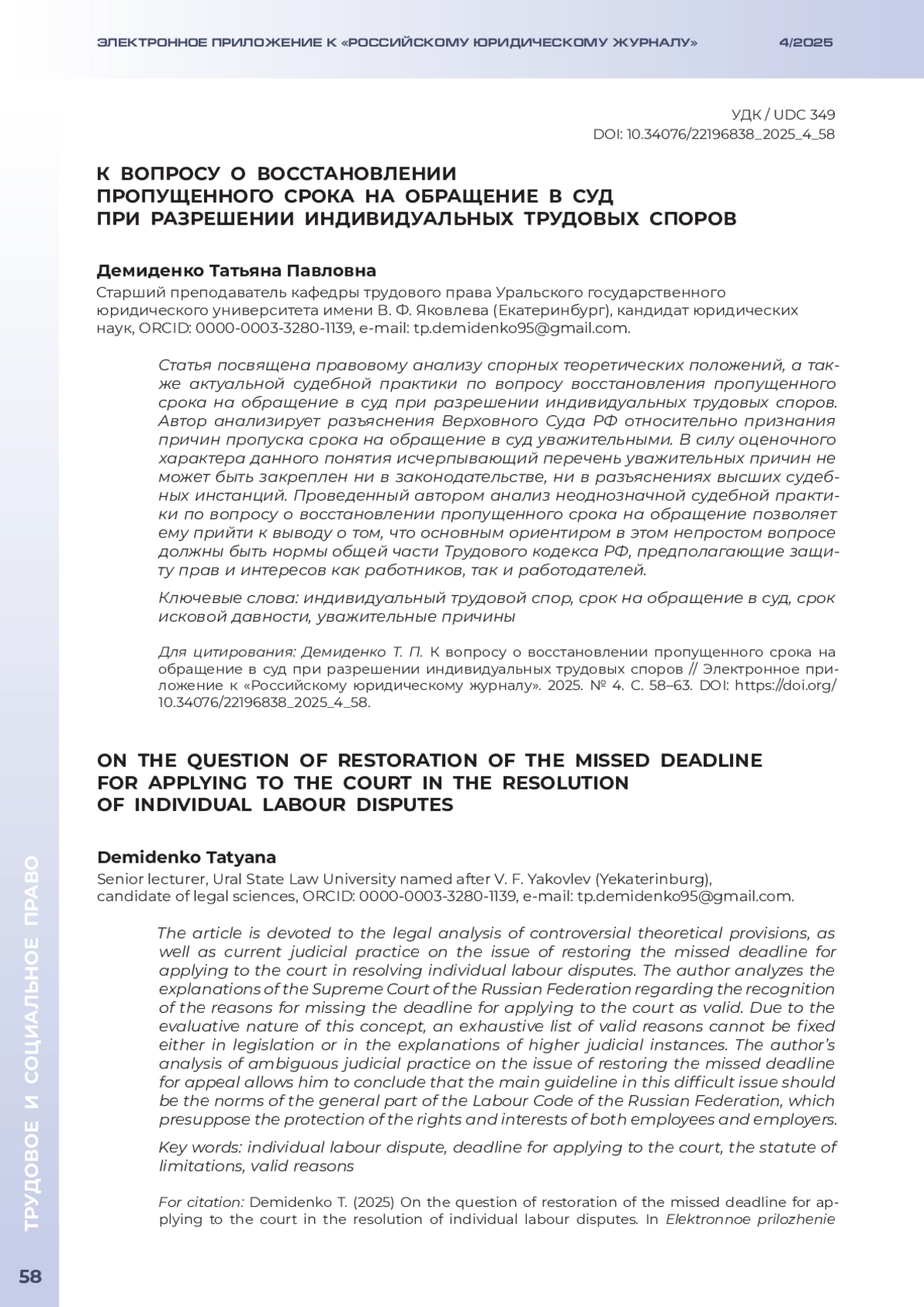 Статья посвящена правовому анализу спорных теоретических положений, а также актуальной судебной практики по вопросу восстановления пропущенного срока на обращение в суд при разрешении индивидуальных трудовых споров. Автор анализирует разъяснения Верховного Суда РФ относительно признания причин пропуска срока на обращение в суд уважительными. В силу оценочного характера данного понятия исчерпывающий перечень уважительных причин не может быть закреплен ни в законодательстве, ни в разъяснениях высших судебных инстанций. Проведенный автором анализ неоднозначной судебной практики по вопросу о восстановлении пропущенного срока на обращение позволяет ему прийти к выводу о том, что основным ориентиром в этом непростом вопросе должны быть нормы общей части Трудового кодекса РФ, предполагающие защиту прав и интересов как работников, так и работодателей.