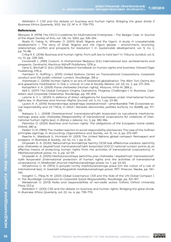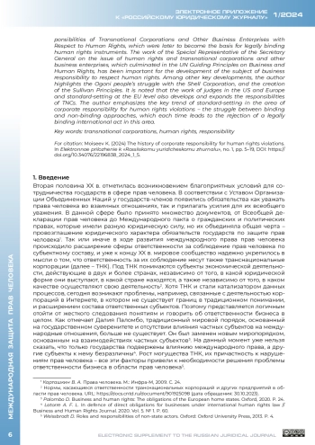 В статье рассматривается развитие института ответственности бизнеса за нарушение прав человека. Отмечается, что защита прав человека являлась одним из основных направлений развития международного права в XX в., что привело в том числе к расширению состава субъектов, которые несут ответственность за соблюдение прав человека. Упоминается деятельность Центра по транснациональным корпорациям ООН, основная задача которого заключалась в разработке Кодекса поведения для ТНК, который предлагал уважать права человека и основные свободы. Дальнейшее развитие института ответственности бизнеса за соблюдение прав человека связывается с принятием Руководящих принципов для многонациональных предприятий ОЭСР, Глобального договора ООН, а также Норм, касающихся ответственности транснациональных корпораций и других предприятий в области прав человека, на основе которых позже предполагалось принять юридически обязательный документ. Деятельность Специального представителя Генерального секретаря по вопросу о правах человека и транснациональных корпорациях и других предприятиях, кульминацией работы которого стала разработка Руководящих принципов предпринимательской деятельности в аспекте прав человека ООН, оказала большое влияние на развитие института ответственности бизнеса за соблюдение прав человека. Среди других ключевых событий можно назвать борьбу народа Огони с корпорацией «Shell», а также создание Принципов Салливана. Деятельность судей в США и Европе и нормотворчество на уровне ЕС также развивает и расширяет ответственность ТНК. Автор подчеркивает ключевую тенденцию нормотворчества в сфере ответственности бизнеса за нарушение прав человека - борьбу юридически обязательных и необязательных подходов, которая каждый раз приводит к отказу от принятия юридически обязательного международного акта в данной сфере.
