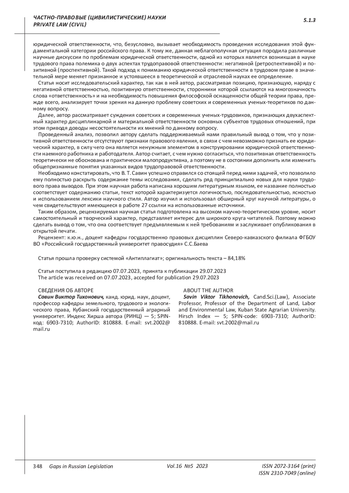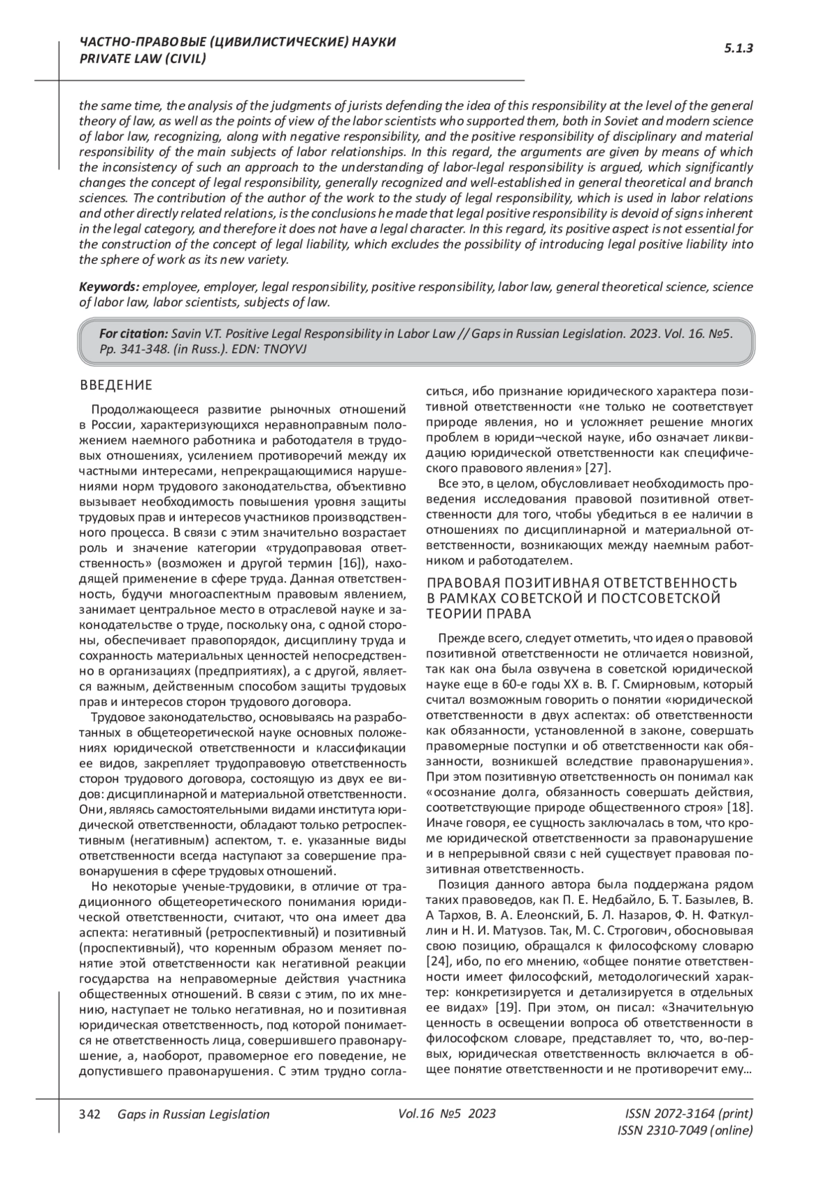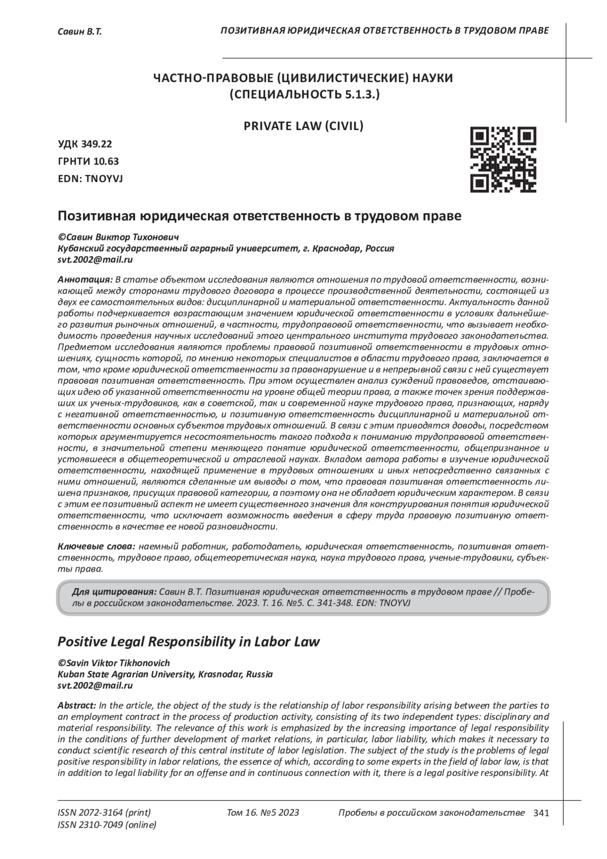 Savin V. T. Problems of the concept of labor and legal responsibility of the labor contract // Actual problems of Russian law. 2014. No.7 (44) July. p. 1397. EDN: TFWVWZ