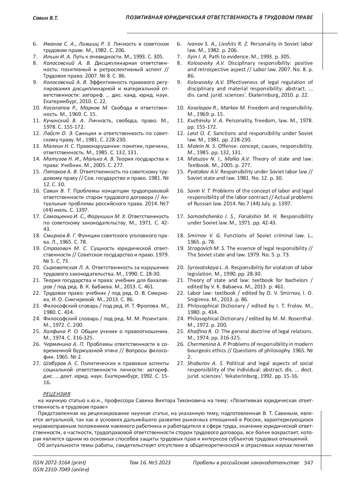 15. Пятаков А. В. Ответственность по советскому трудовому праву // Сов. государство и право. 1981. № 12. С. 30.