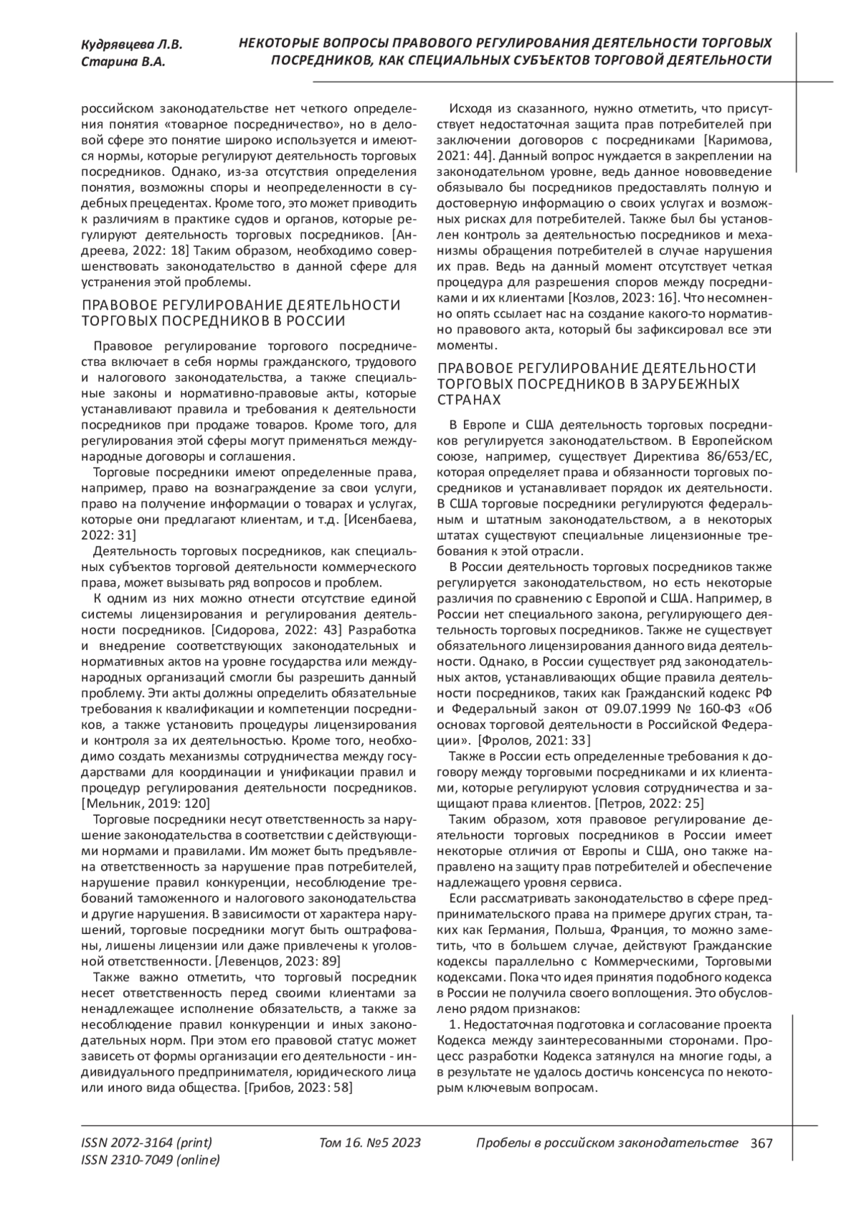 12. Петров А.Н. Правовые аспекты деятельности торговых посредников в России // Журнал “Юридический вестник”, №1, 2022, с. 23-27.