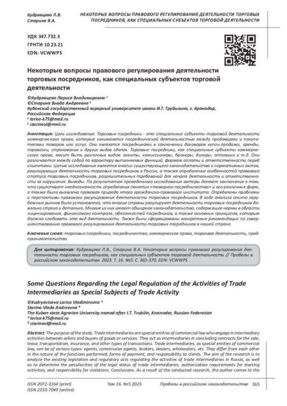 Цель исследования. Торговые посредники - это специальные субъекты торговой деятельности коммерческого права, которые занимаются посреднической деятельностью между продавцами и покупателями товаров или услуг. Они являются посредниками в заключении договоров купли-продажи, аренды, перевозки, страхования и других видов сделок. Торговые посредники, как специальные субъекты коммерческого права, могут быть различных видов: агенты, комиссионеры, брокеры, дилеры, оптовики и т. д. Они различаются между собой по характеру выполняемых функций, формам оплаты и ответственности перед клиентами. Целью исследования является анализ существующего законодательства и нормативных актов, регулирующих деятельность торговых посредников в России, а также определение особенностей правового статуса торговых посредников, разрешительных требований для начала деятельности и ответственности за нарушения. Выводы. По результатам проведенного исследования авторы делают заключение о том, что существует неоднозначность определения понятия «товарное посредничество» и его различных форм, а также была выявлена правовая природа этого гражданско-правового института. Определены проблемы и перспективы правового регулирования деятельности торговых посредников. В ходе анализа опыта зарубежных рынков было установлено, что многие страны регулируют деятельность торговых посредников довольно строго и детально. Многие из них имеют обширное законодательство, содержащее нормы в области лицензирования, финансового контроля, обязанностей посредников, а также основных принципов, которым должно следовать это вид деятельности. Также были сформированы конкретные рекомендации по совершенствованию правового регулирования деятельности торговых посредников в нашей стране.