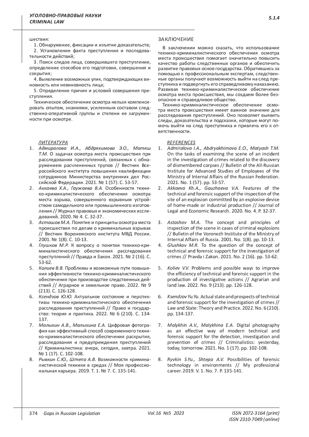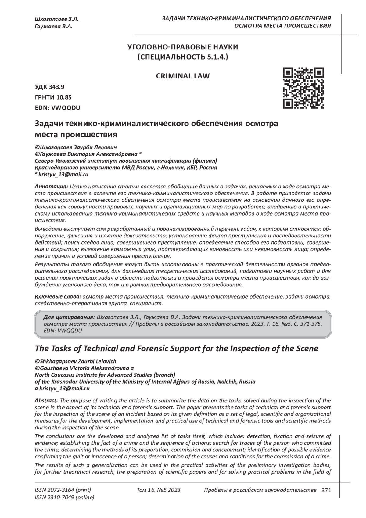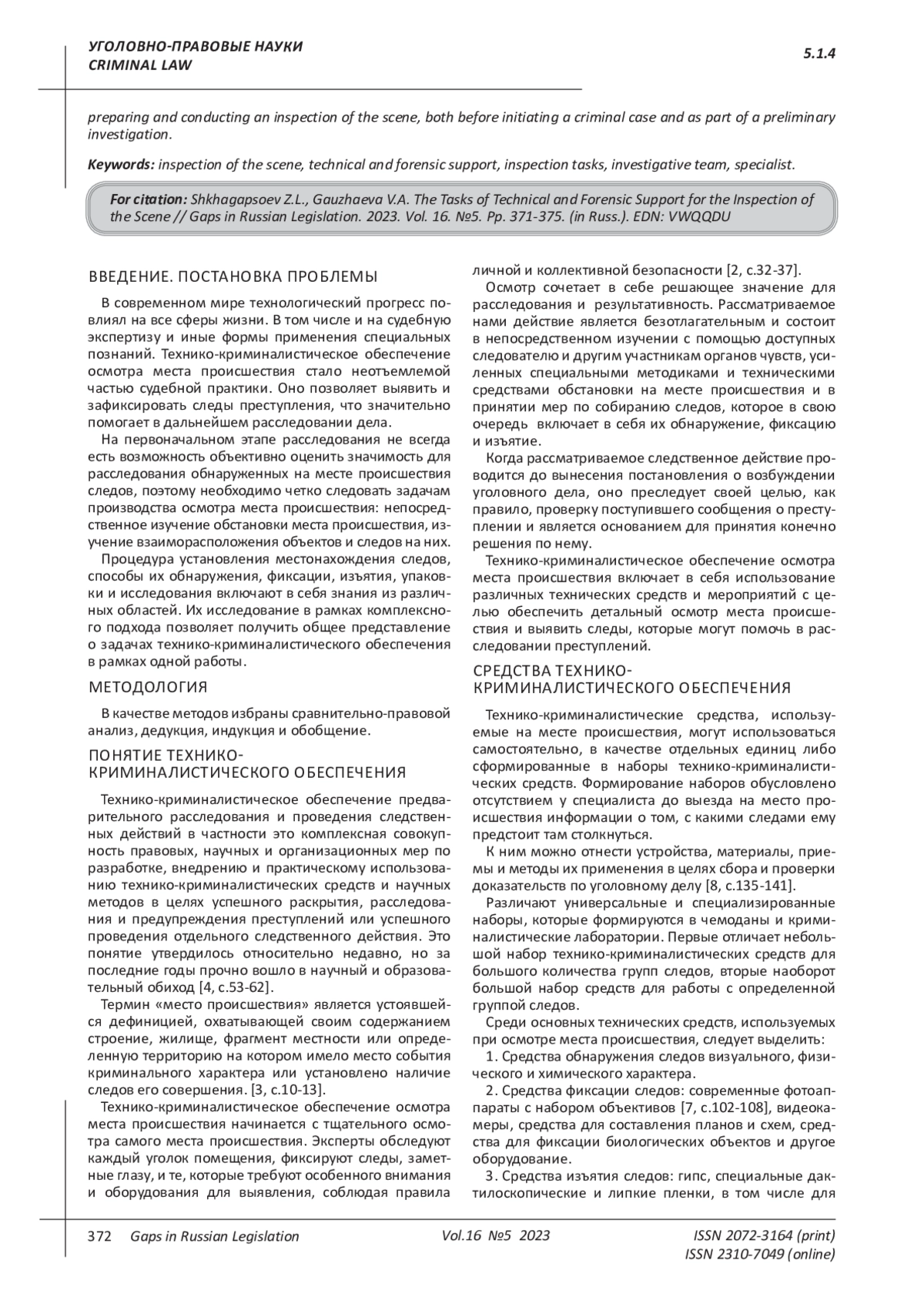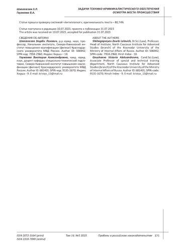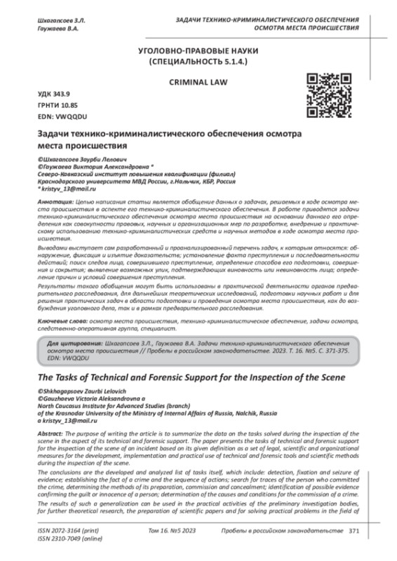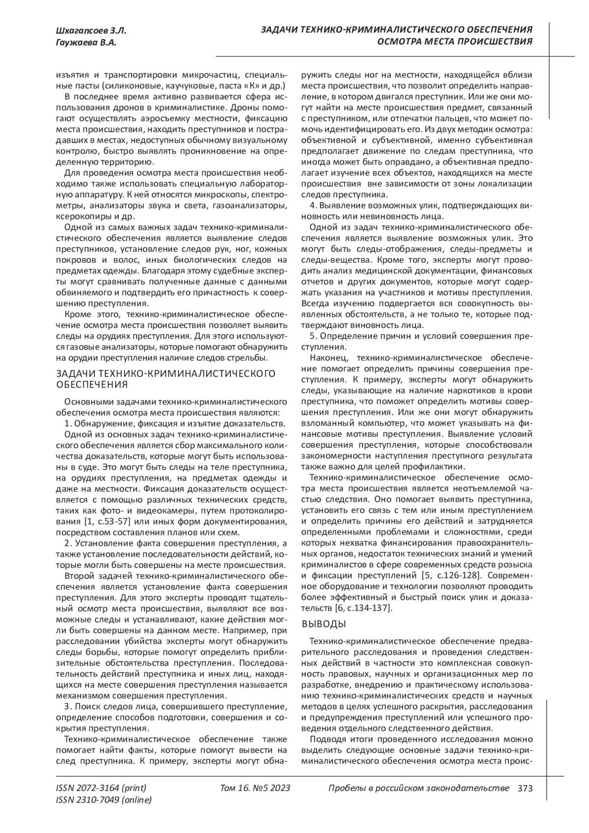 ШХАГАПСОЕВ З. Л., ГАУЖАЕВА В. А. ЗАДАЧИ ТЕХНИКО-КРИМИНАЛИСТИЧЕСКОГО ОБЕСПЕЧЕНИЯ ОСМОТРА МЕСТА ПРОИСШЕСТВИЯ // ПРОБЕЛЫ В РОССИЙСКОМ ЗАКОНОДАТЕЛЬСТВЕ. 2023. Т. 16 № 5