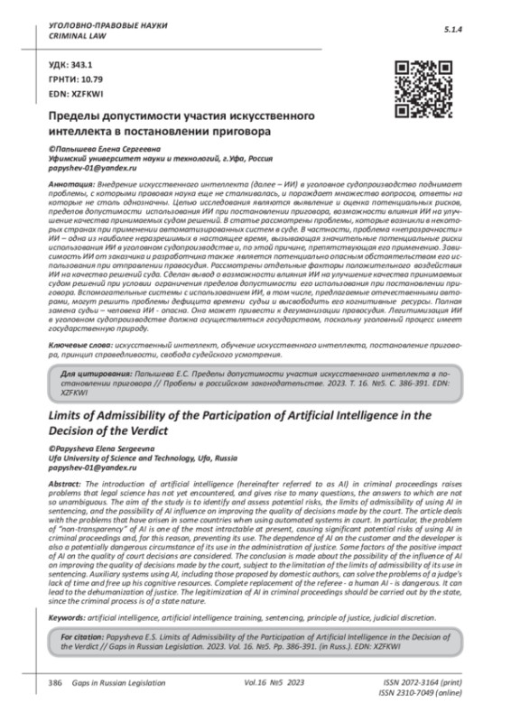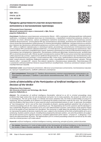 Статья: ПРЕДЕЛЫ ДОПУСТИМОСТИ УЧАСТИЯ ИСКУССТВЕННОГО ИНТЕЛЛЕКТА В ПОСТАНОВЛЕНИИ ПРИГОВОРА (2023)
