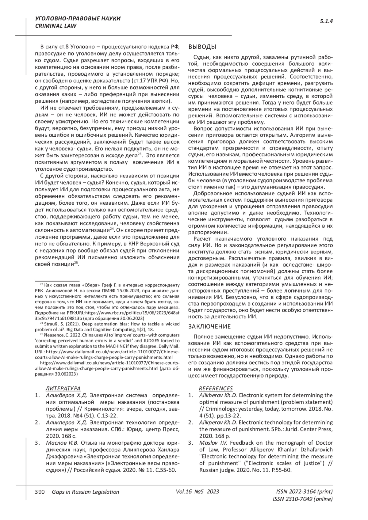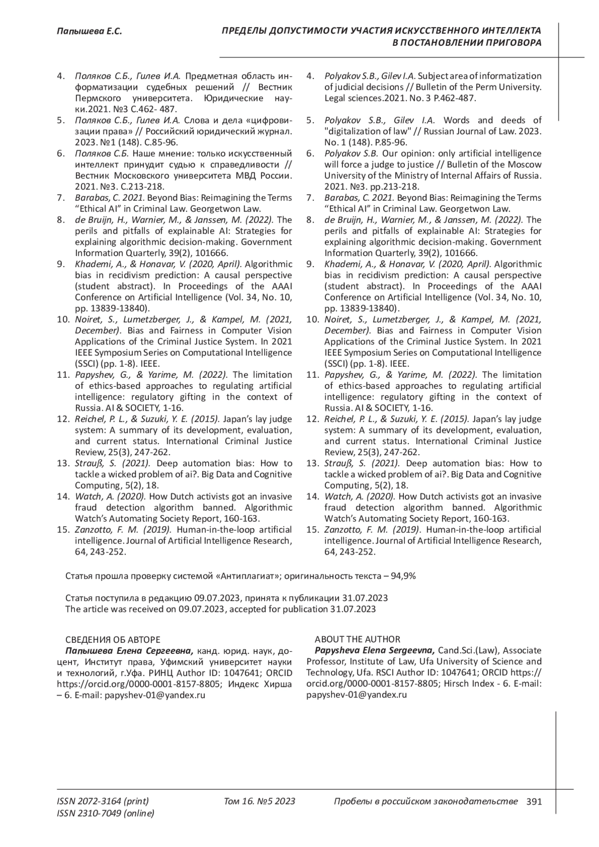 ЕЛЕНА С. П. ПРЕДЕЛЫ ДОПУСТИМОСТИ УЧАСТИЯ ИСКУССТВЕННОГО ИНТЕЛЛЕКТА В ПОСТАНОВЛЕНИИ ПРИГОВОРА // ПРОБЕЛЫ В РОССИЙСКОМ ЗАКОНОДАТЕЛЬСТВЕ. 2023. Т. 16 № 5