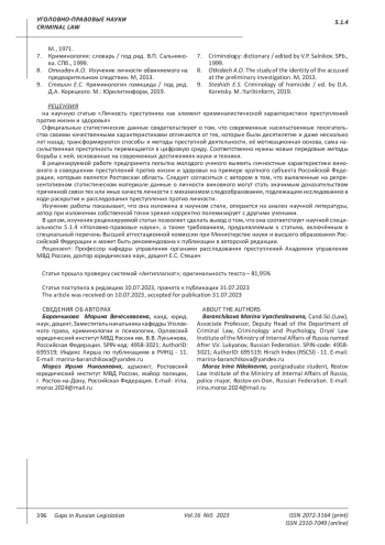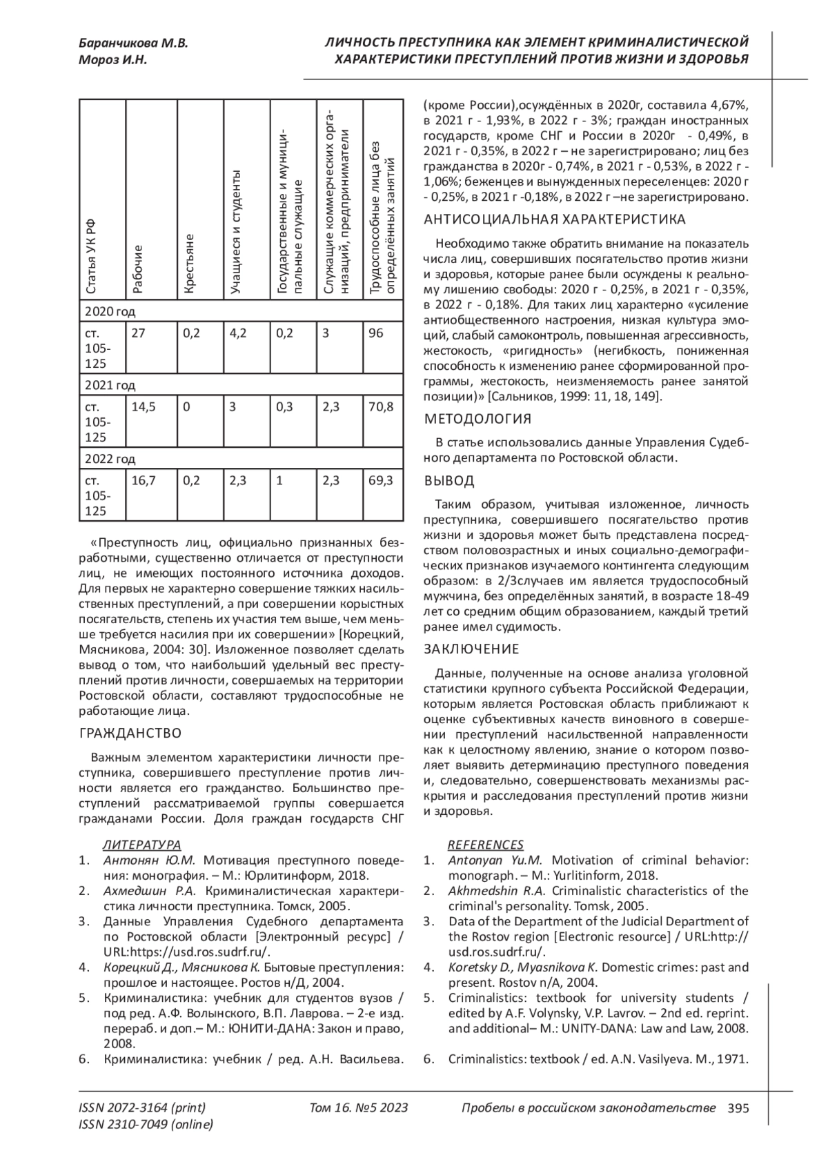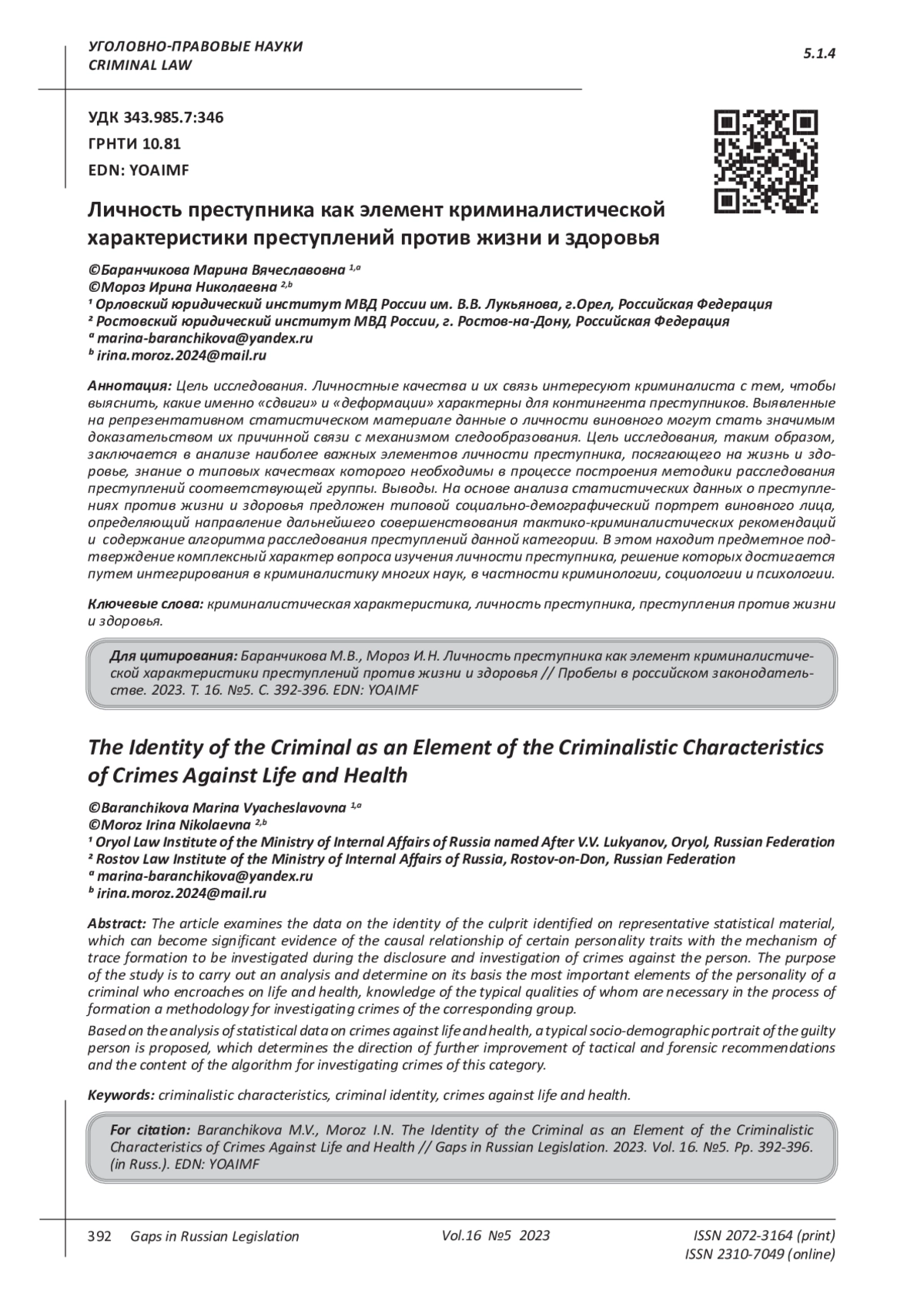 БАРАНЧИКОВА М. В., МОРОЗ И. Н. ЛИЧНОСТЬ ПРЕСТУПНИКА КАК ЭЛЕМЕНТ КРИМИНАЛИСТИЧЕСКОЙ ХАРАКТЕРИСТИКИ ПРЕСТУПЛЕНИЙ ПРОТИВ ЖИЗНИ И ЗДОРОВЬЯ // ПРОБЕЛЫ В РОССИЙСКОМ ЗАКОНОДАТЕЛЬСТВЕ. 2023. Т. 16 № 5