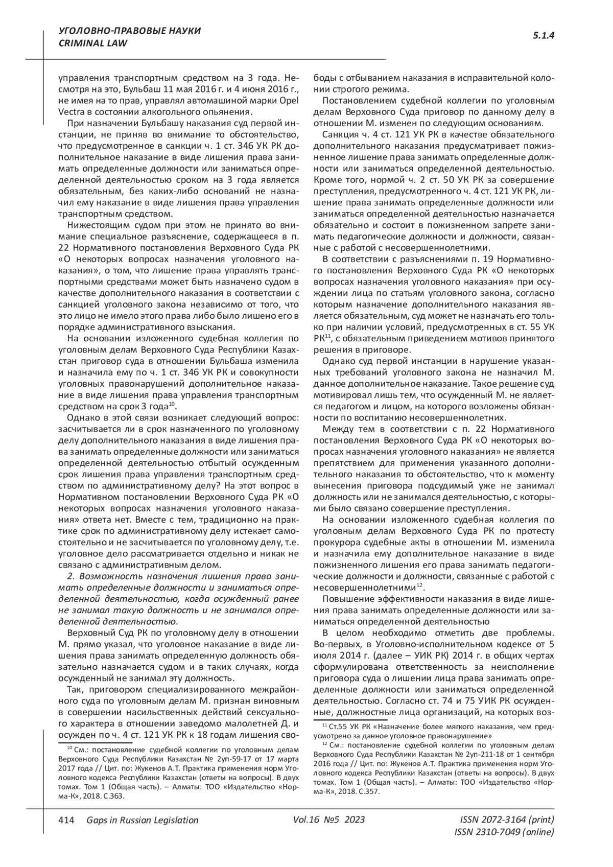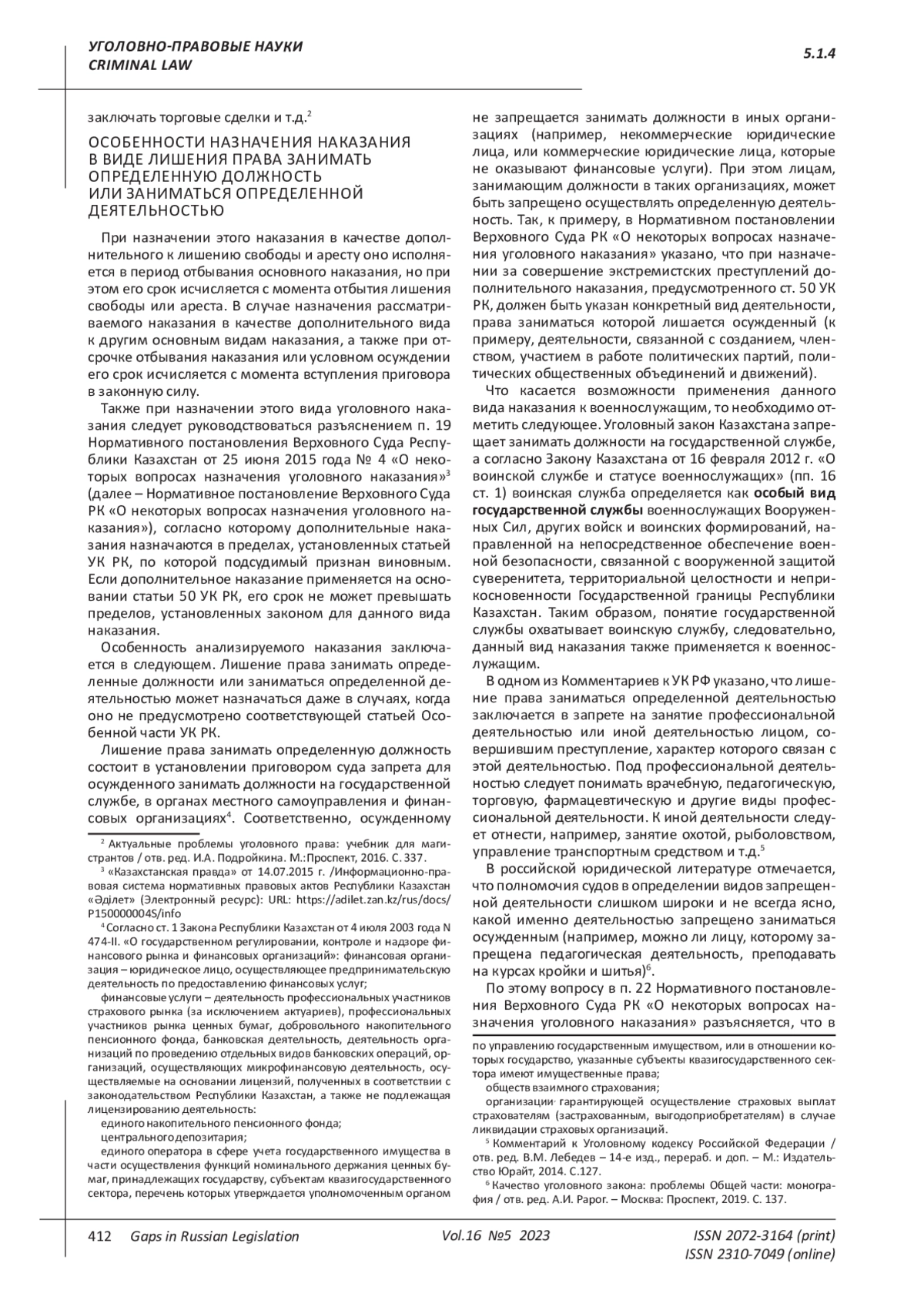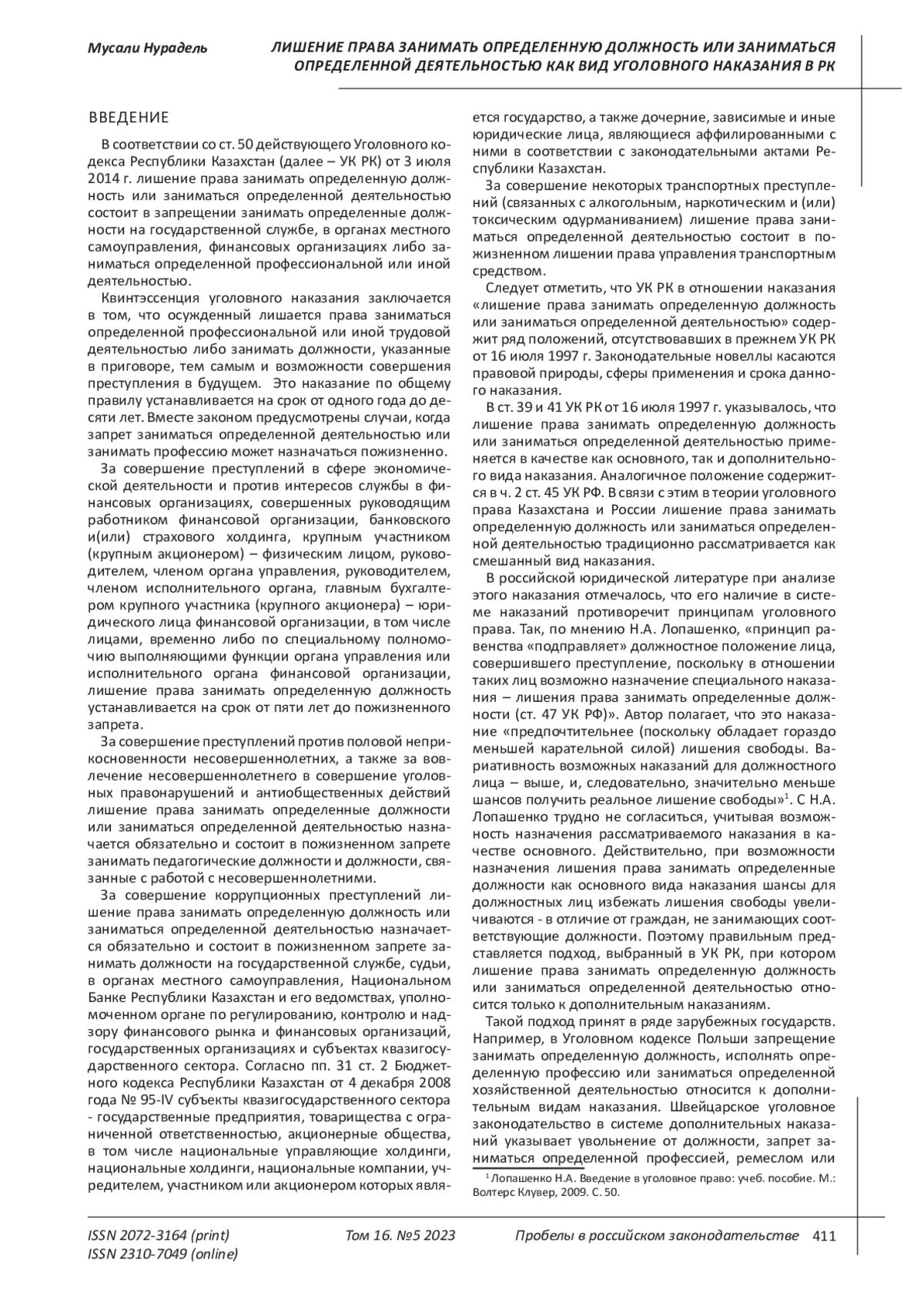 МУСАЛИ Н. ЛИШЕНИЕ ПРАВА ЗАНИМАТЬ ОПРЕДЕЛЕННУЮ ДОЛЖНОСТЬ ИЛИ ЗАНИМАТЬСЯ ОПРЕДЕЛЕННОЙ ДЕЯТЕЛЬНОСТЬЮ КАК ВИД УГОЛОВНОГО НАКАЗАНИЯ В РЕСПУБЛИКЕ КАЗАХСТАН // ПРОБЕЛЫ В РОССИЙСКОМ ЗАКОНОДАТЕЛЬСТВЕ. 2023. Т. 16 № 5