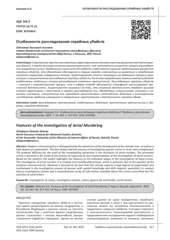 3. Баталина В.И., Гаврилова Д.Ф. Проблемы методики расследования серийных убийств // Международный журнал гуманитарных и естественных наук. 2022. № 12-1 (75). С. 25-28. EDN: PEULGB