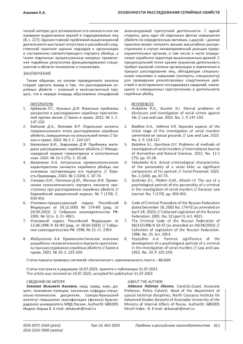 1. Ардашев Р.Г., Кузьмин Д.И. Извечные проблемы раскрытия и расследования серийных преступлений против жизни // Закон и право. 2022. № 1. С. 147-150. EDN: HMAAXR