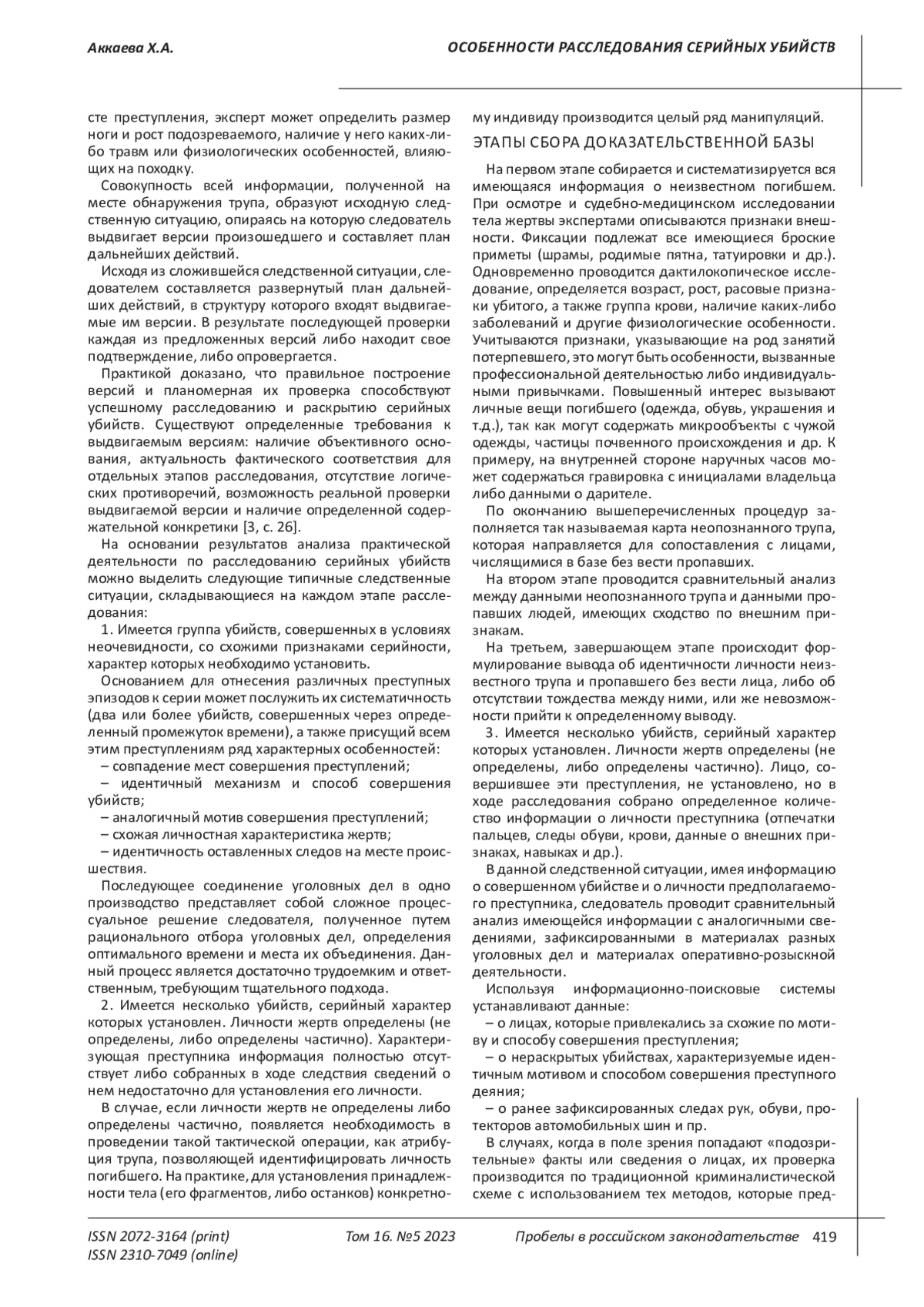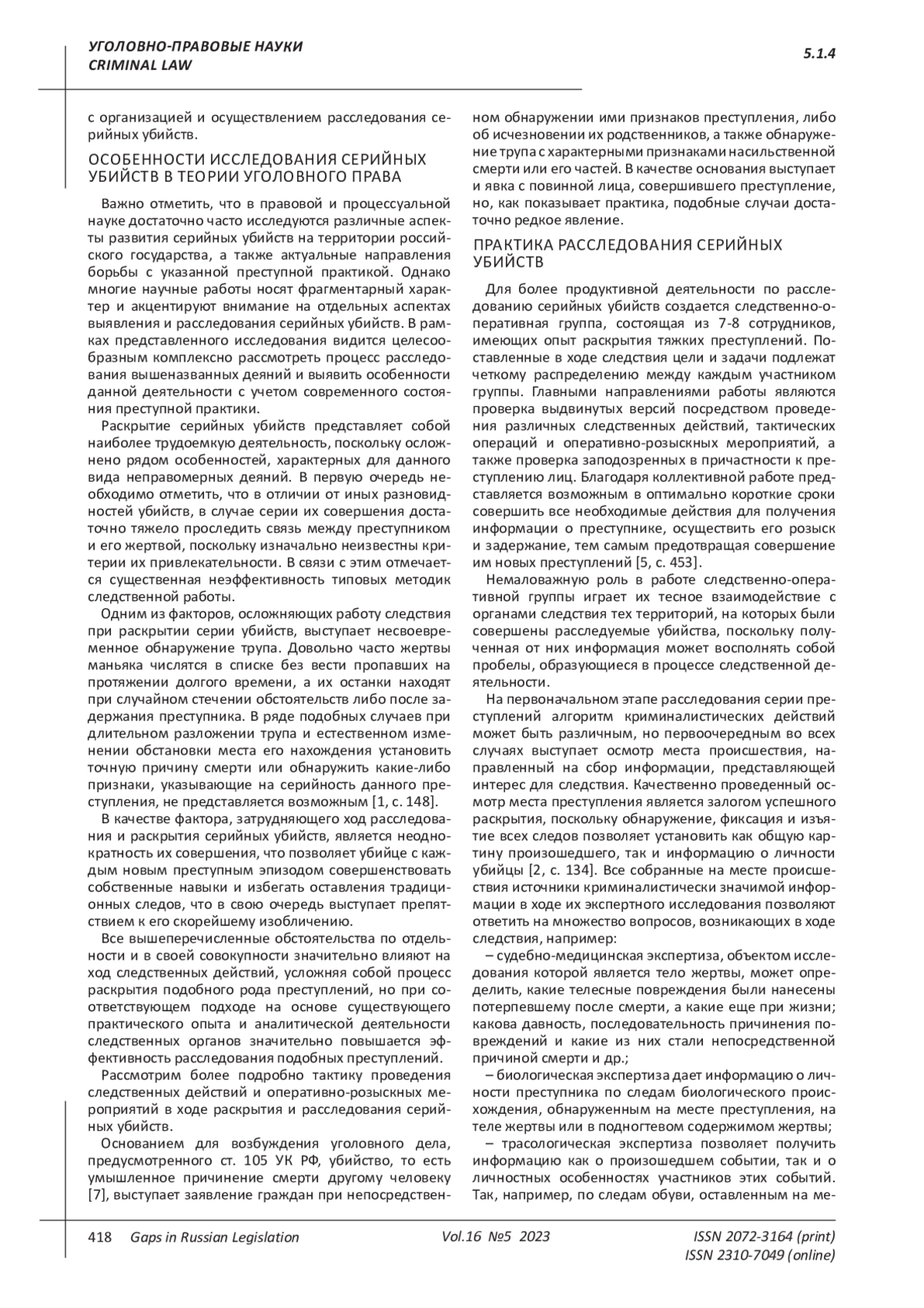 2. Бадиков Д.А., Волкова В.Р. Отдельные аспекты первоначального этапа расследования серийных убийств, совершенных на сексуальной почве // Закон и право. 2023. № 1. С. 134-137. EDN: CIYHCQ
