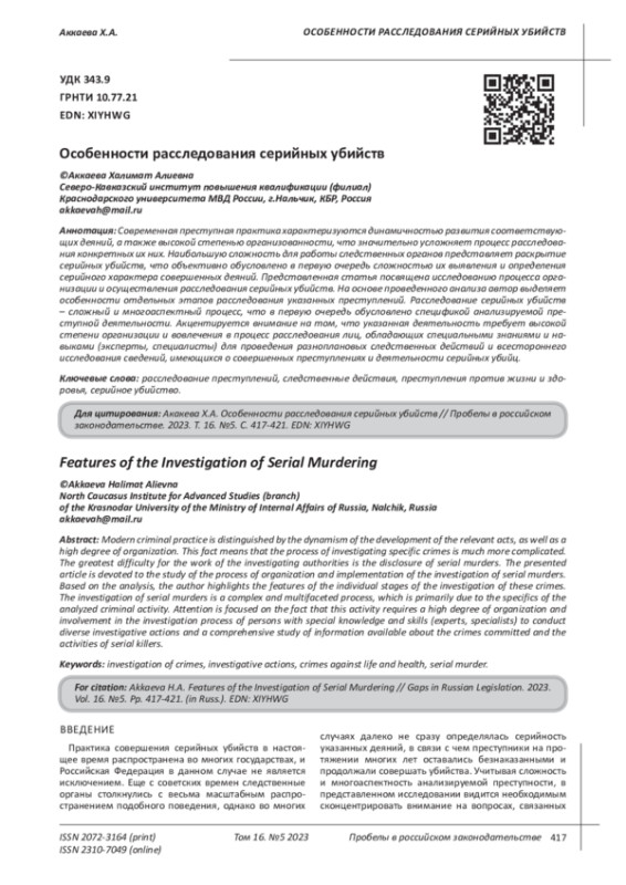 Badikov D.A., Volkova V.R. Separate aspects of the initial stage of the investigation of serial murders committed on sexual grounds // Law and Law. 2023. No. 1. P. 134-137. EDN: CIYHCQ