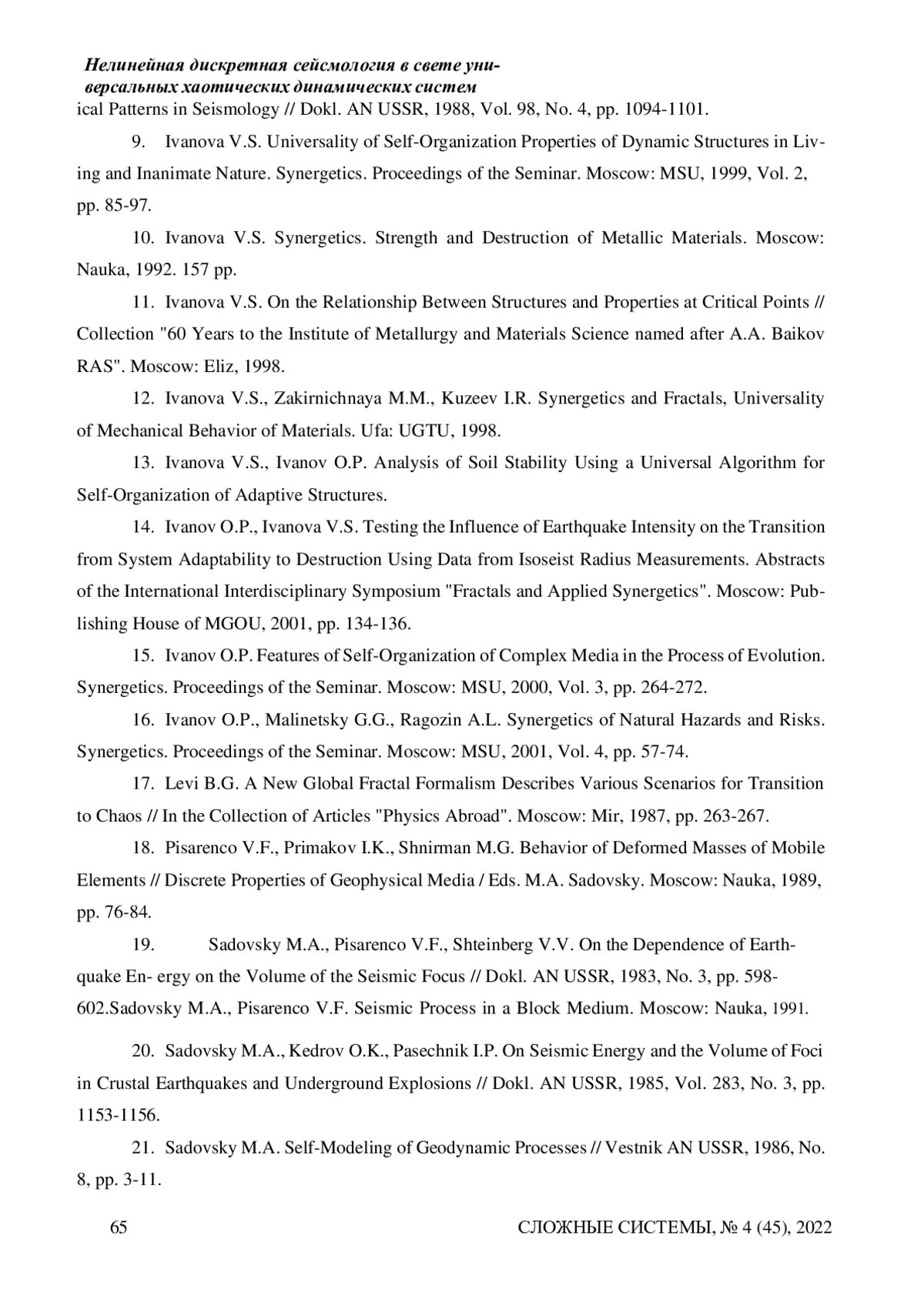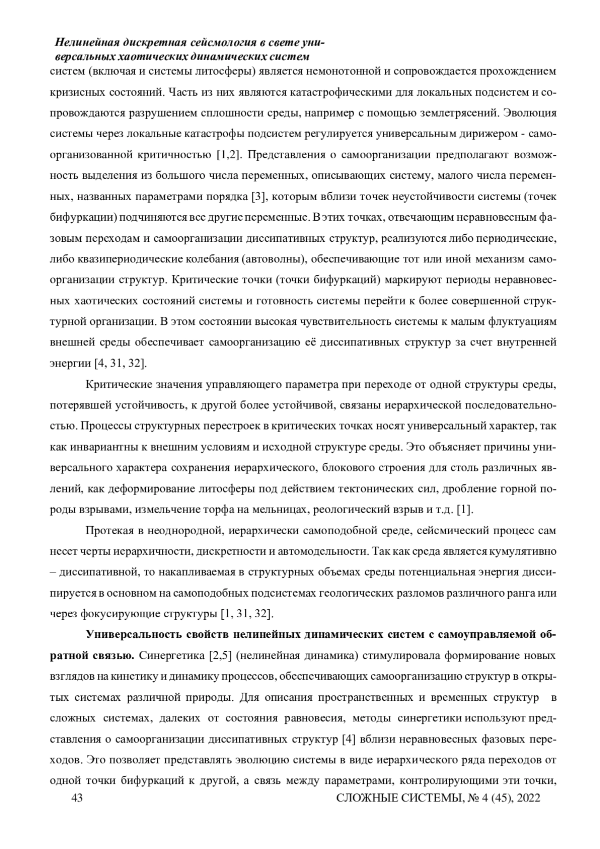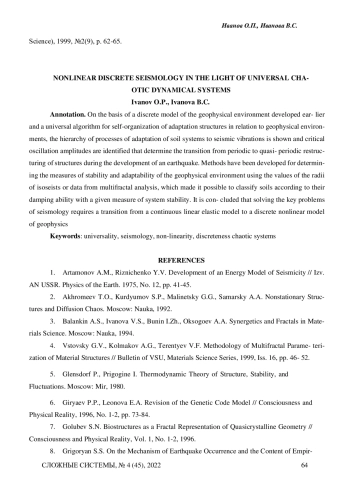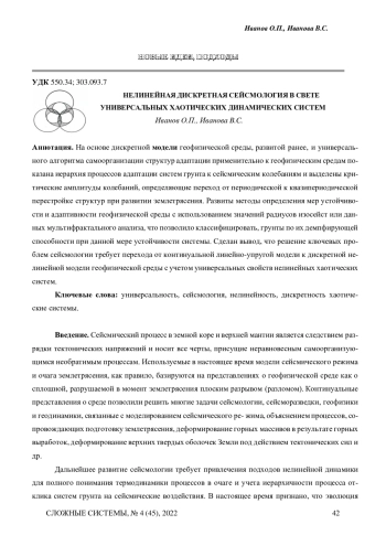 ИВАНОВ О. П. НЕЛИНЕЙНАЯ ДИСКРЕТНАЯ СЕЙСМОЛОГИЯ В СВЕТЕ УНИВЕРСАЛЬНЫХ ХАОТИЧЕСКИХ ДИНАМИЧЕСКИХ СИСТЕМ // СЛОЖНЫЕ СИСТЕМЫ. 2022. №4 (45)